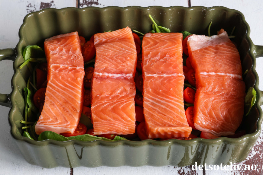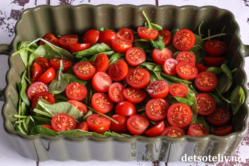 Legg spinat og halve cherrytomater i en ildfast form (ca. 20 x 30 cm).