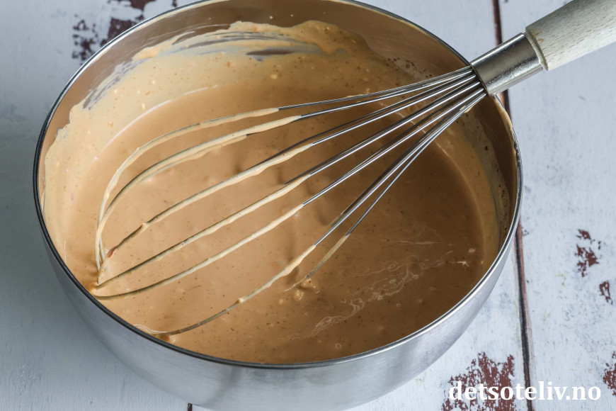Ha crème fraîche, fløte, sweet chilisaus, pressede hvitløksfedd, soyasaus og paprikapulver i en bolle. Visp ingrediensene til sausen raskt sammen.