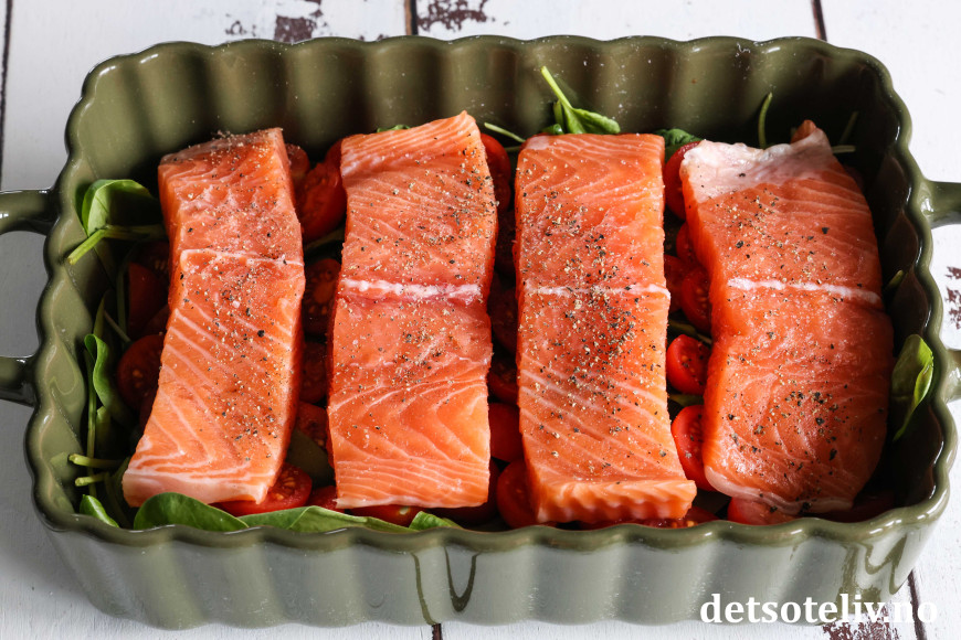 Legg laksefiletene oppå, og krydre med kvernet salt og pepper.