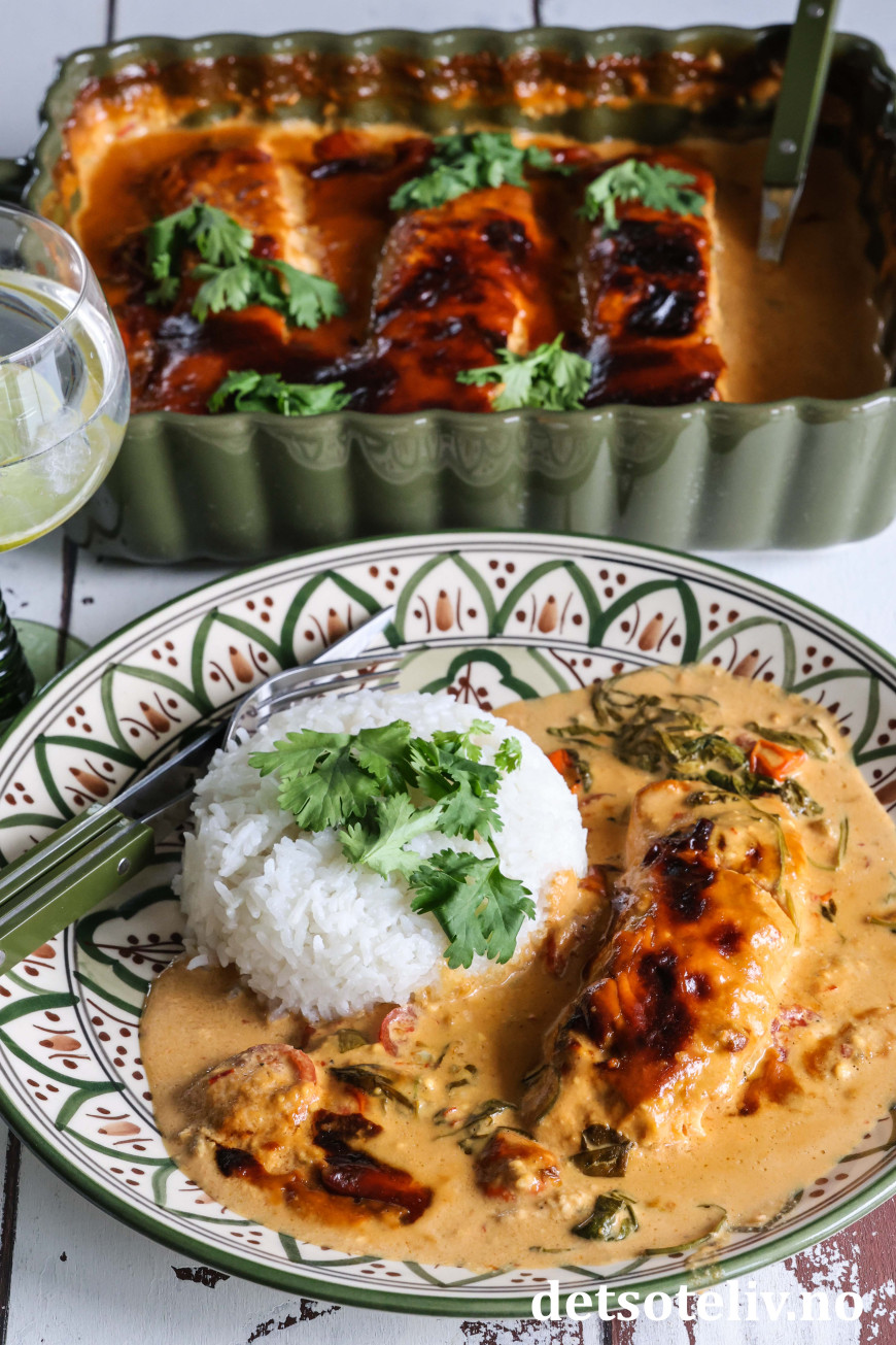 Serveres varm og nylaget. Server kokt jasminris ved siden av og topp med frisk koriander hvis du liker det.