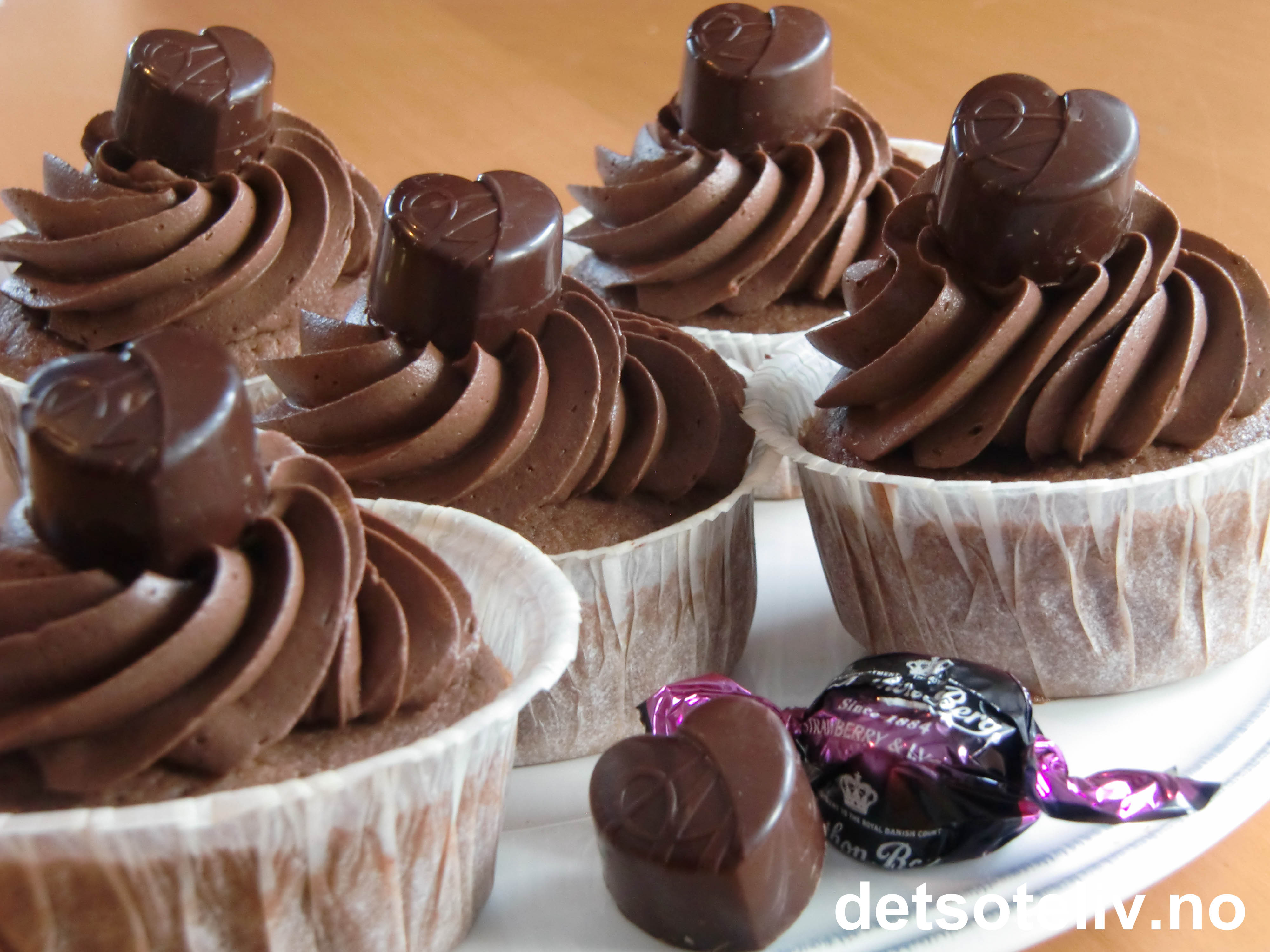 Her har jeg brukt varianten med bærsmak og lagt en konfekt i midten av 8 store, myke sjokolademuffins. På toppen pyntet jeg med fluffy sjokoladekrem og enda en hjertekonfekt.