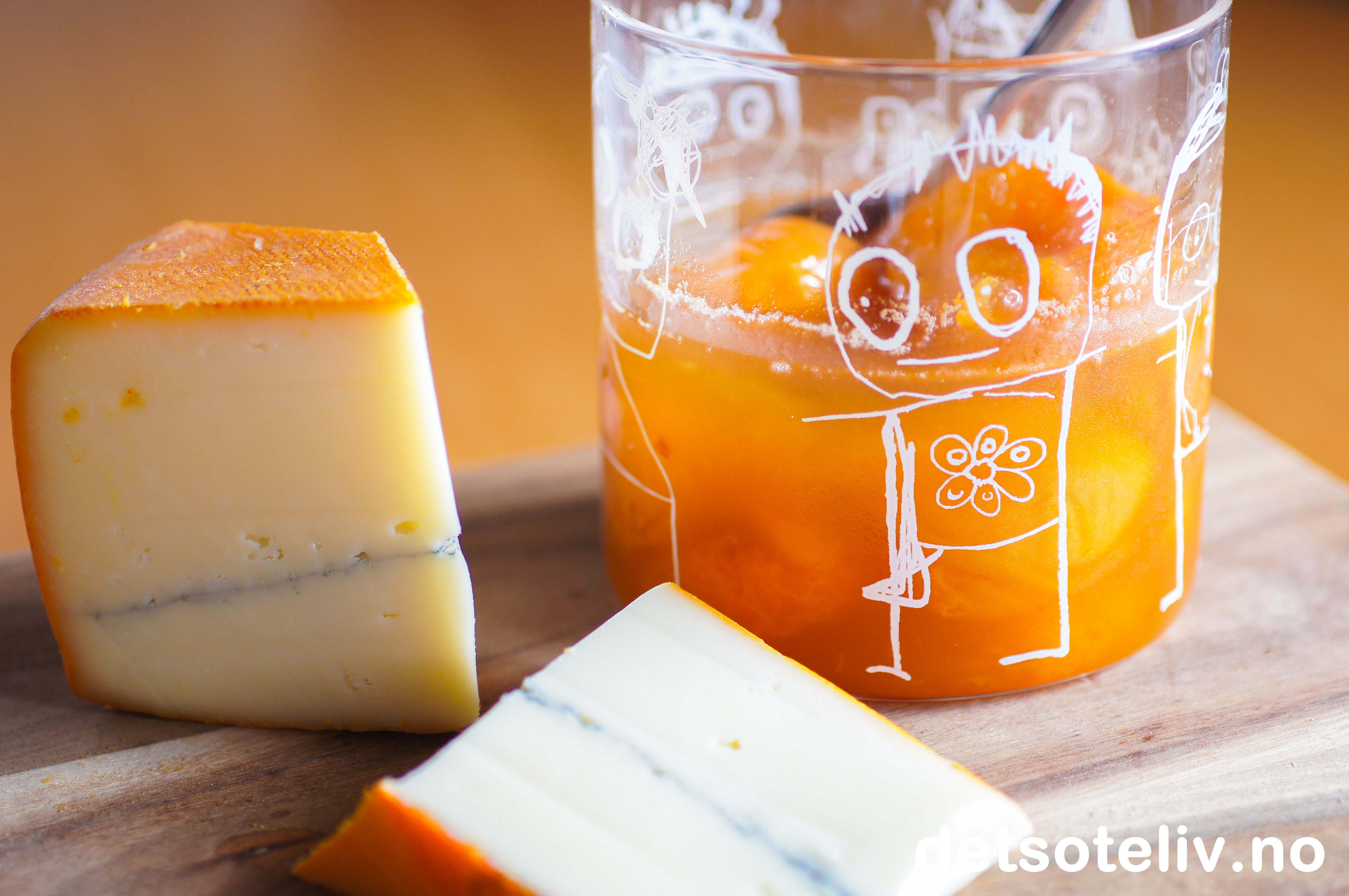 Eksempler på oster som passer veldig godt til syltede aprikoser er Camembert, Brie, Ridderost, Jarlsberg og Royal Morbier som jeg har brukt her.