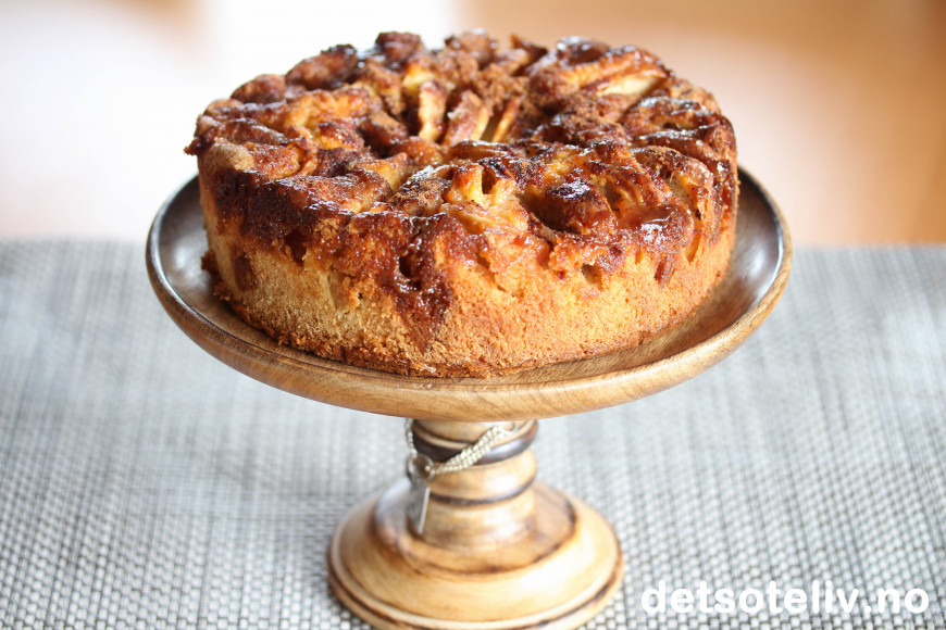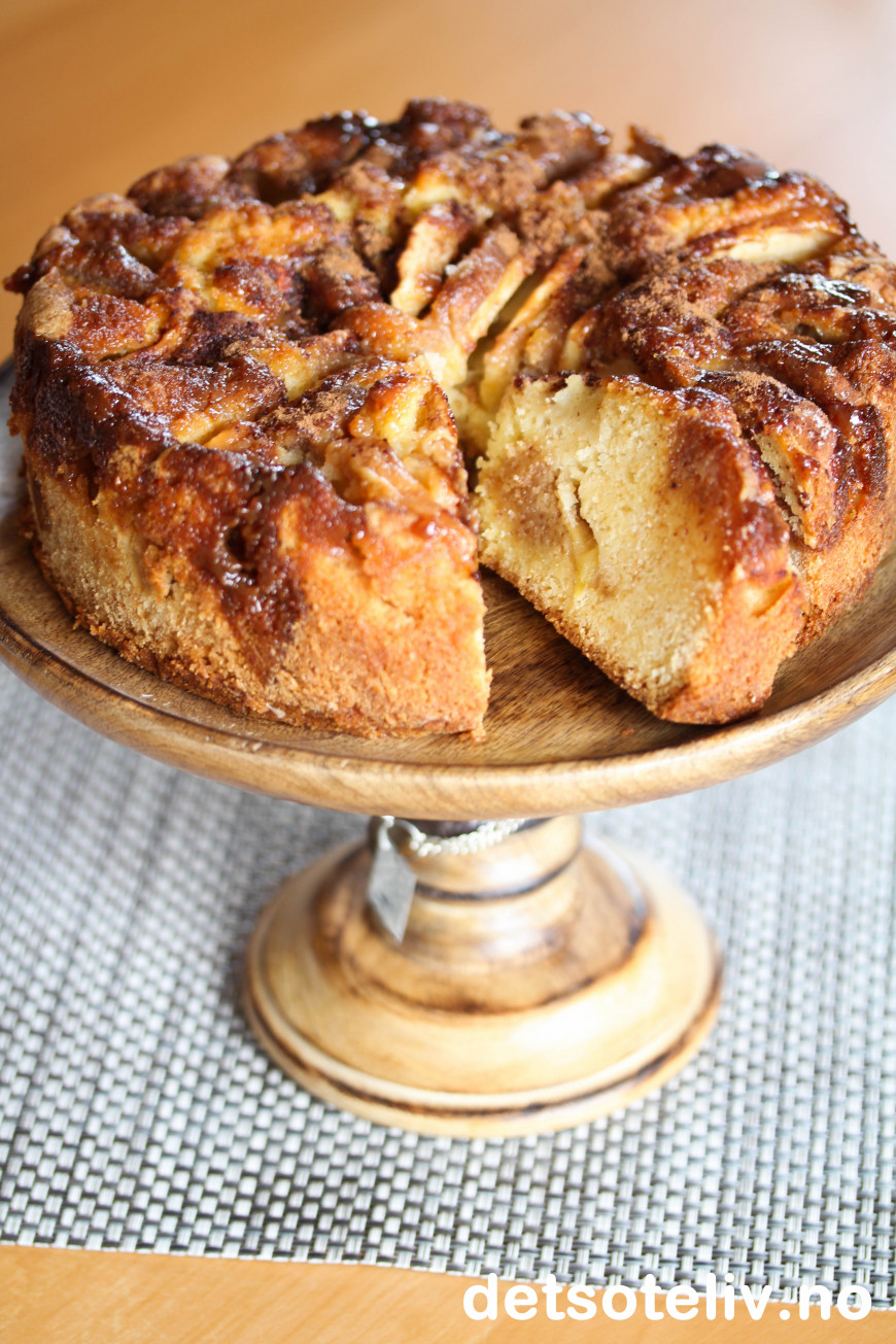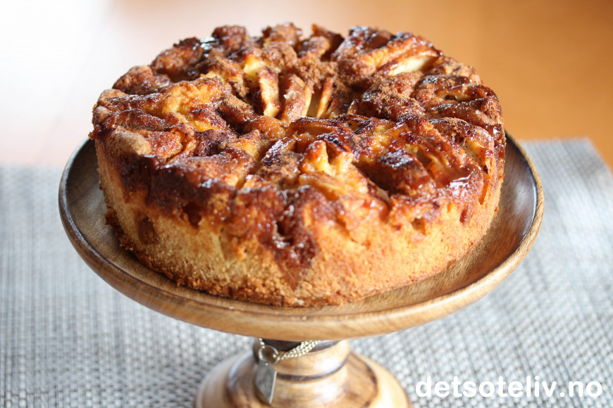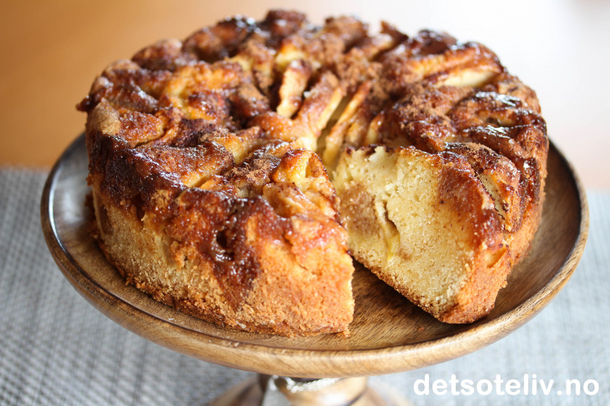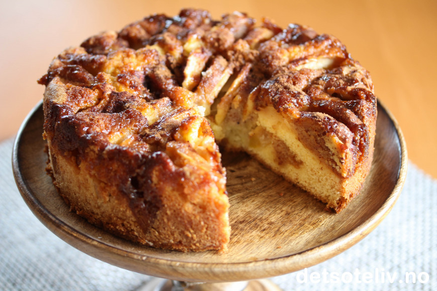 Dette er i utgangspunktet en vanlig eplekakeoppskrift, men kaken er gjort ekstra deilig og "syndig" ved at den inneholder hemmelig kransekakemasse og karamellsaus i tillegg til epleskiver, sukker og kanel.