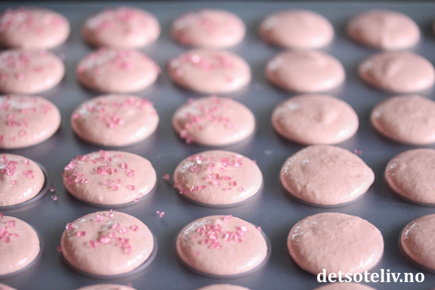 Dryss gjerne litt rosa sukker på makronene til pynt.