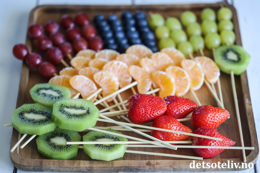 Rens frukt og bær, og tørk av dem med kjøkkenpapir så de er faste og tørre. Lag små fruktspyd ved å tre biter av frukt og bær på små grillspyd (se tips).