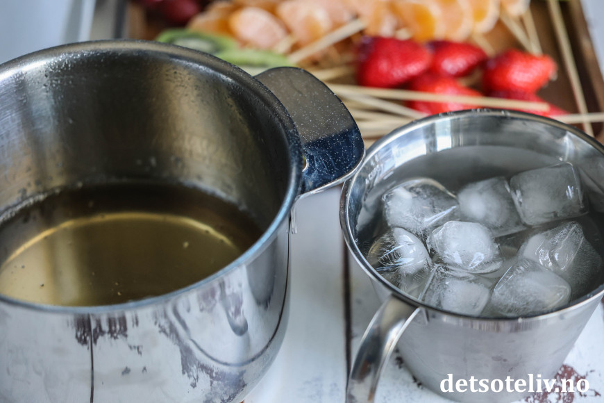 ♥ Det er lurt å bruke en kjele som ikke er så vid og som har høye kanter, slik at du får litt dybde i sukkerlaken for å dyppe fruktspydene i. Du kan også vende litt på kjelen og holde den litt på skrå slik at det blir lettere å dekke fruktspydene med laken.