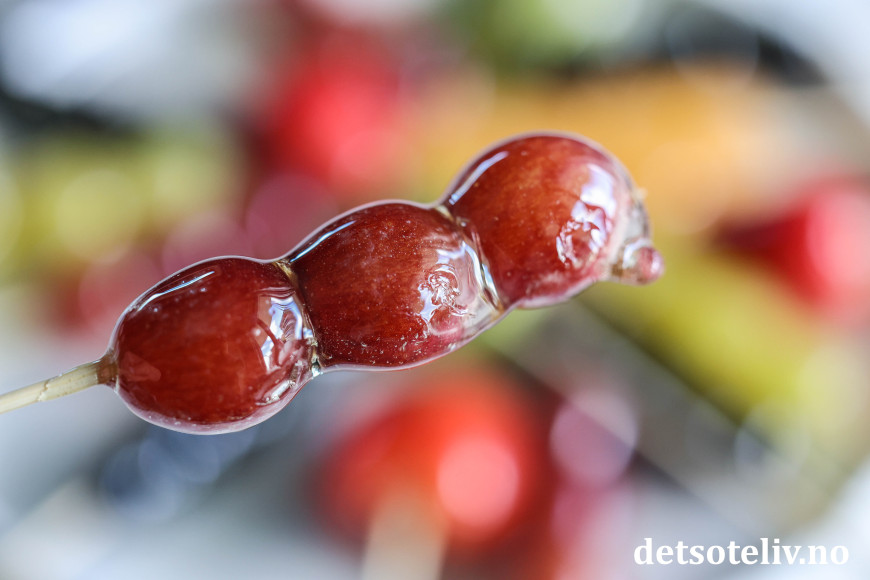 ♥ Tanghulu bør spises så nylaget som mulig. Dersom fruktspydene blir liggende for lenge, vil fruktsaften gjøre at sukkerglasuren smelter og blir bløt.
