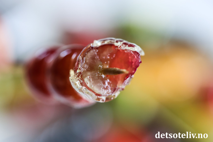 ♥ Tanghulu er best når sukkerglasuren rundt fruktbitene er tynt. Vær nokså rask når du dypper fruktspydene i sukkerlaken, og la de renne litt av seg over kjelen slik at du fjerner overflødig lake før du dypper spydene i isvannet.
