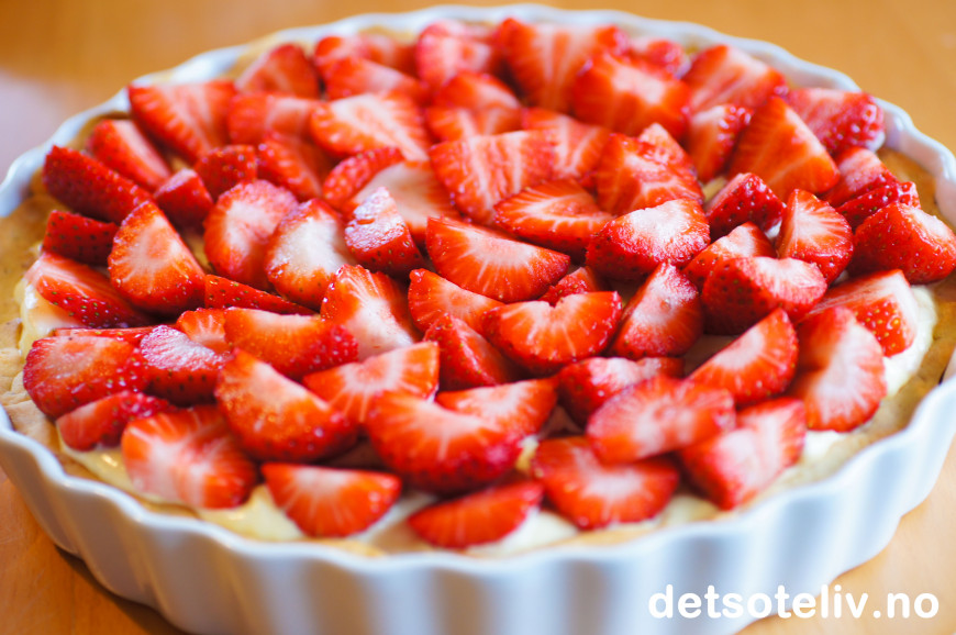Fyll vaniljekremen i tertebunnen. Dekk med jordbær i skiver.