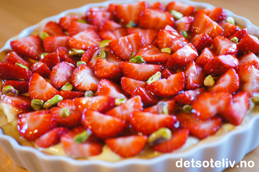 Fyll vaniljekremen i tertebunnen. Dekk med jordbær i skiver. Pynt gjerne kaken med pistasjnøtter. Jeg gnir dem litt med et kjøkkenhånkle for å få frem den grønne fargen best mulig.