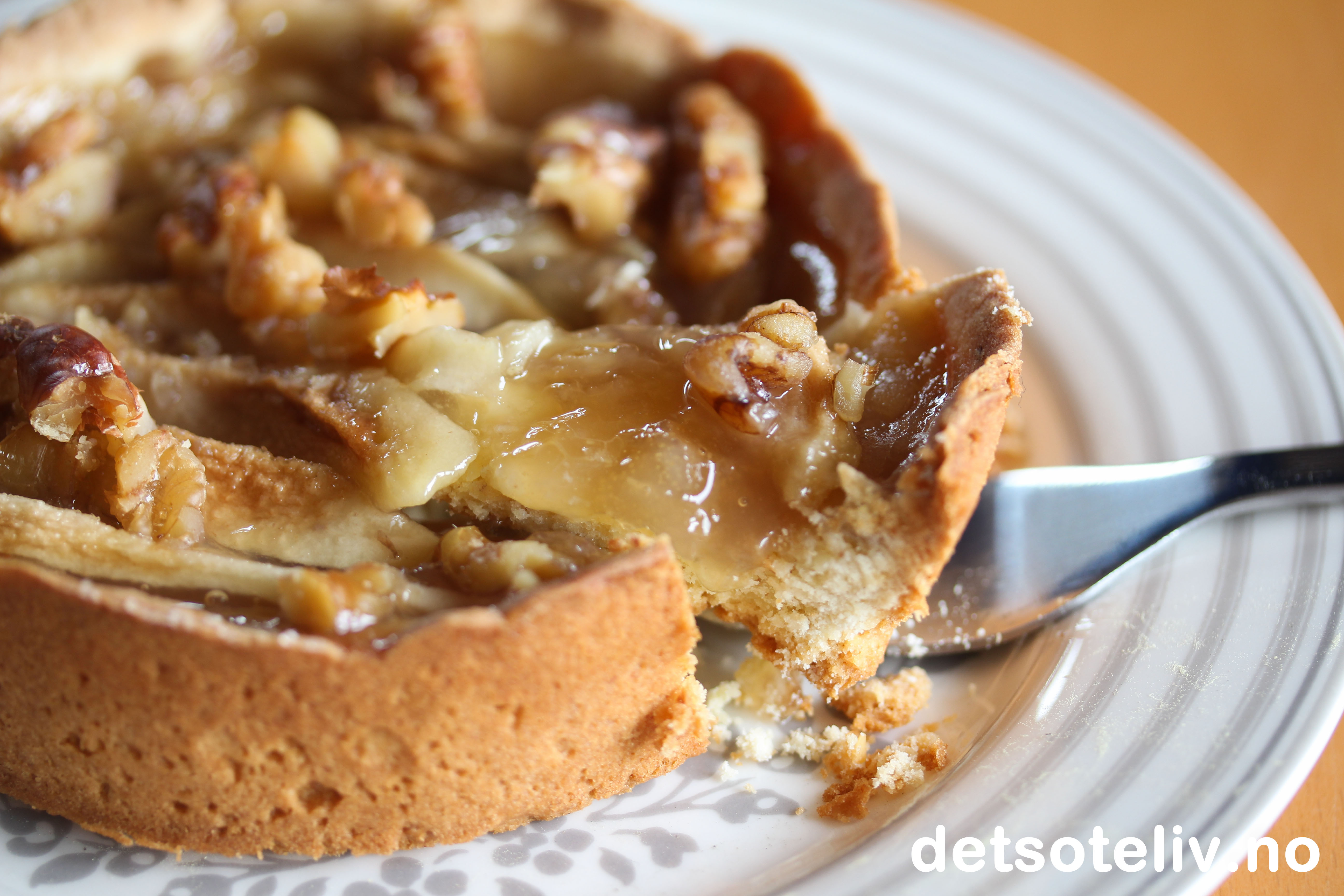 Her har jeg brukt pærer til å lage en nydelig, fransk pæreterte. For å gjøre den ekstra god, har jeg tilsatt malte mandler i bunnen, og så dekket med pæresyltetøy i tillegg til pæreskivene, og til slutt pyntet med store biter valnøtter.