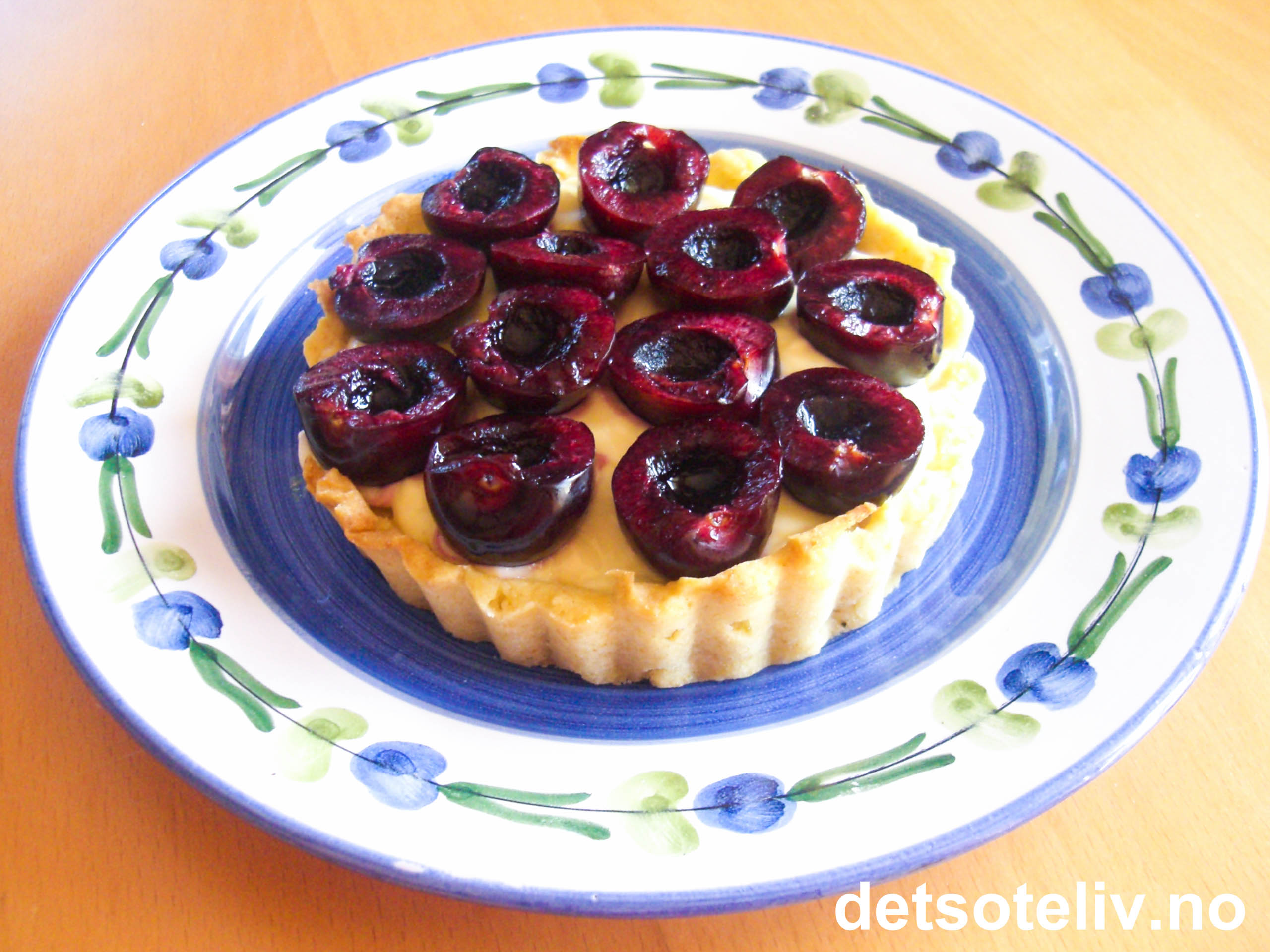 Sett de kalde kakene på tallerkener. Smør vaniljekremen utover bunnen og pynt med halve moreller (eller annen frukt eller bær, se tips).