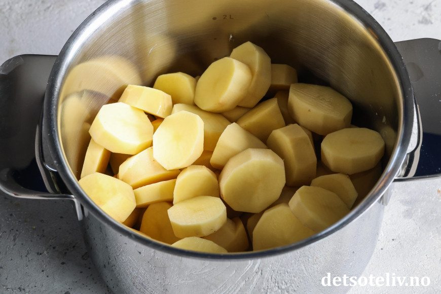 Skrell potetene og del dem i litt mindre biter. Ha potetbitene i en kjele.