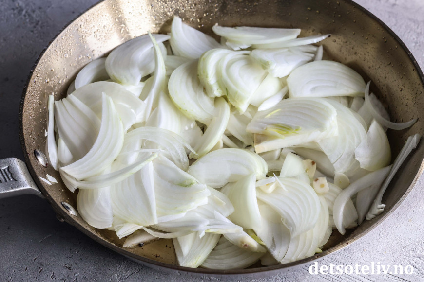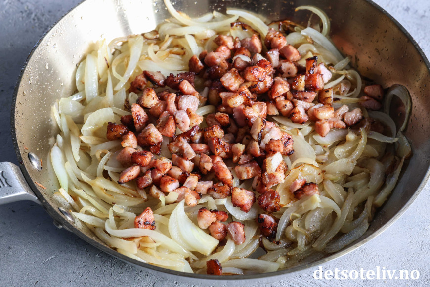 Sett stekt bacon (og stekefettet i pannen) til side. Ha litt smør i pannen og tilsett løk skåret i tynne skiver og finhakket hvitløk. La løken steke på middels varme til den er blank og gyllen.