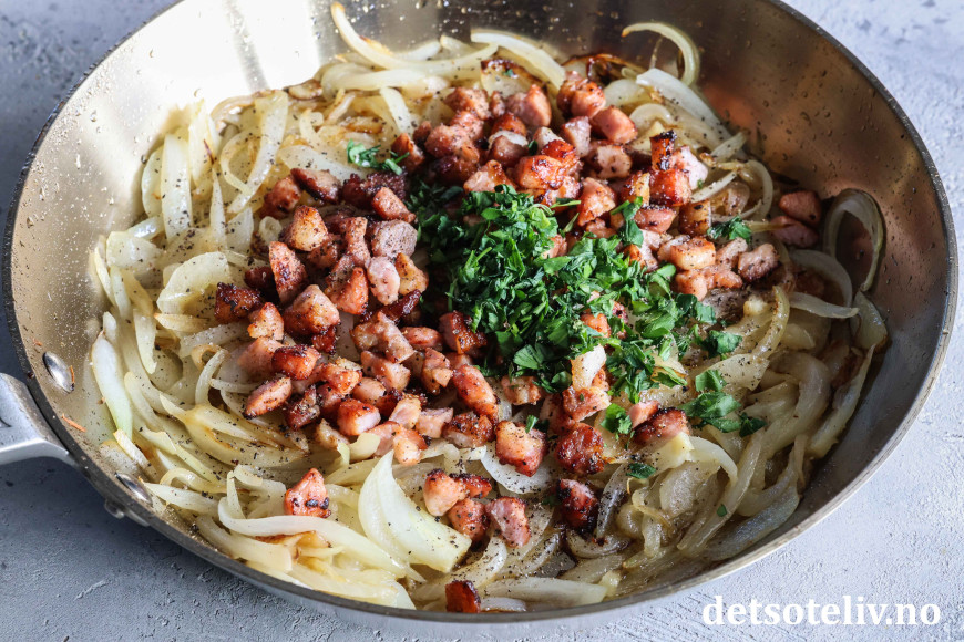 Ha løk- og baconblandingen over potetene i formen.