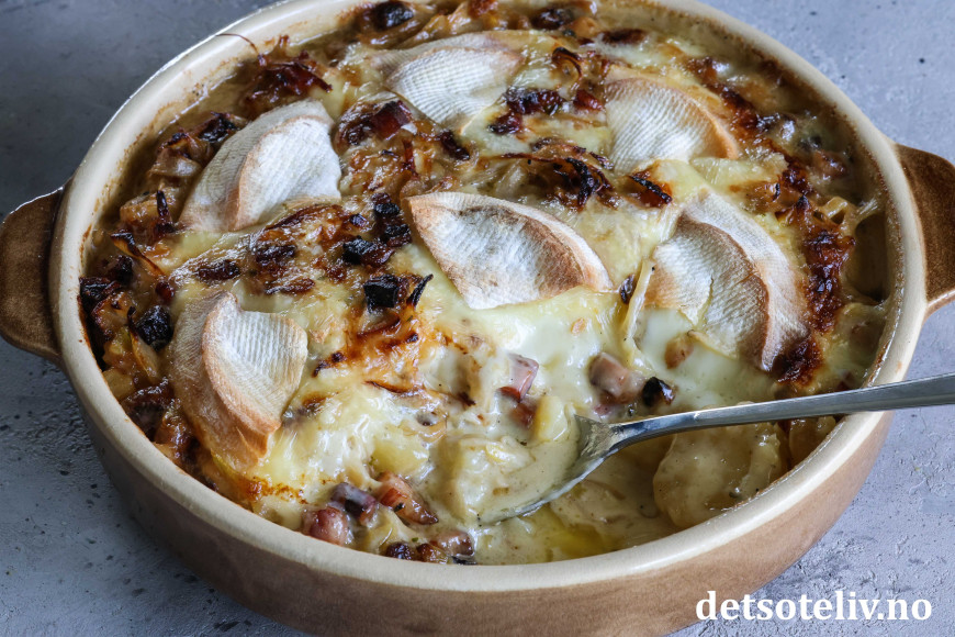 Tartiflette er en fantastisk god, fransk potetgrateng med løk, bacon, hvitvin, fløte og Reblochon.