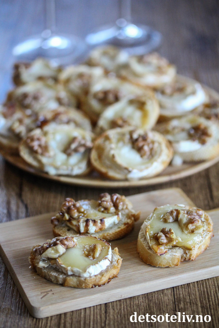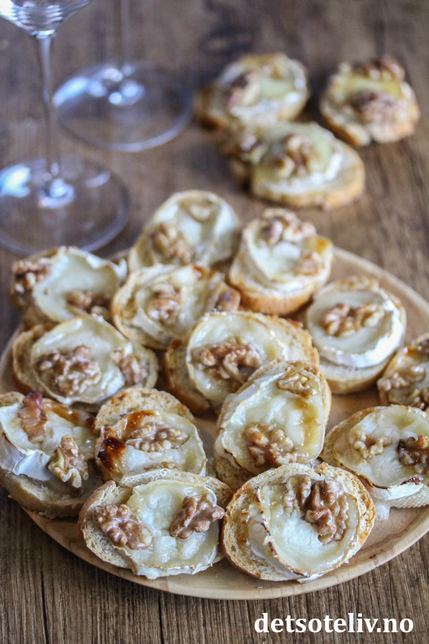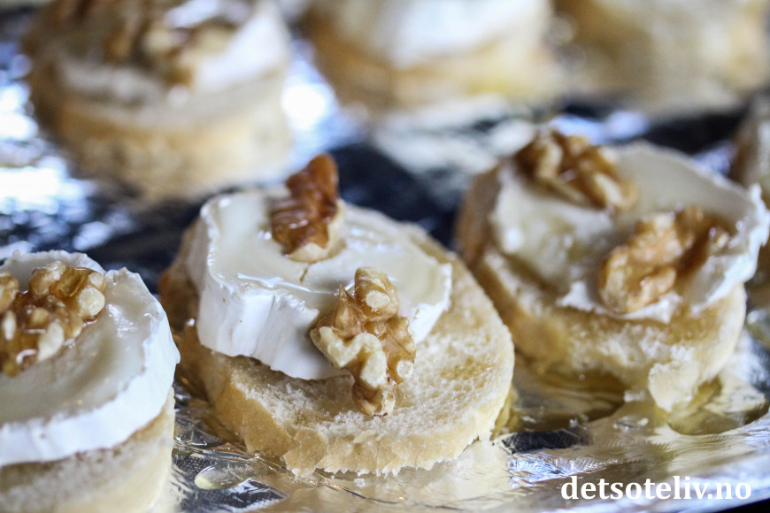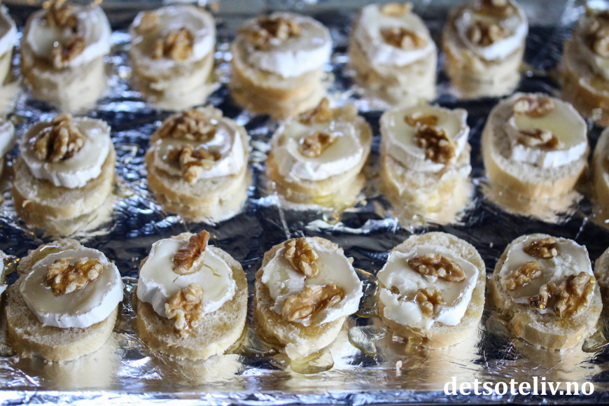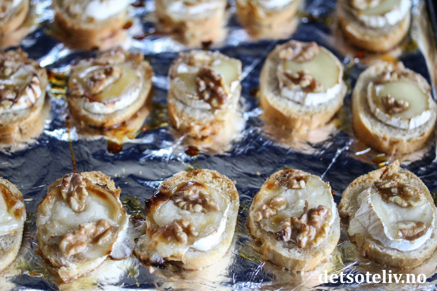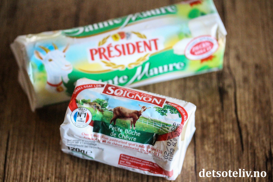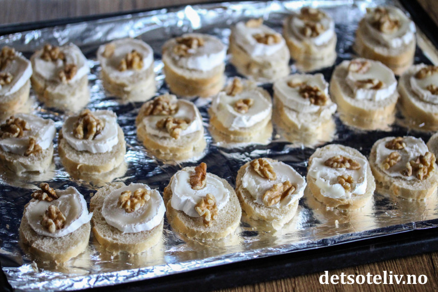♥ Chèvre er en fransk geitost. Jeg har her brukt chèvreruller med skorpe, som skjært i skiver passer perfekt i størrelse til små baguetteskiver.