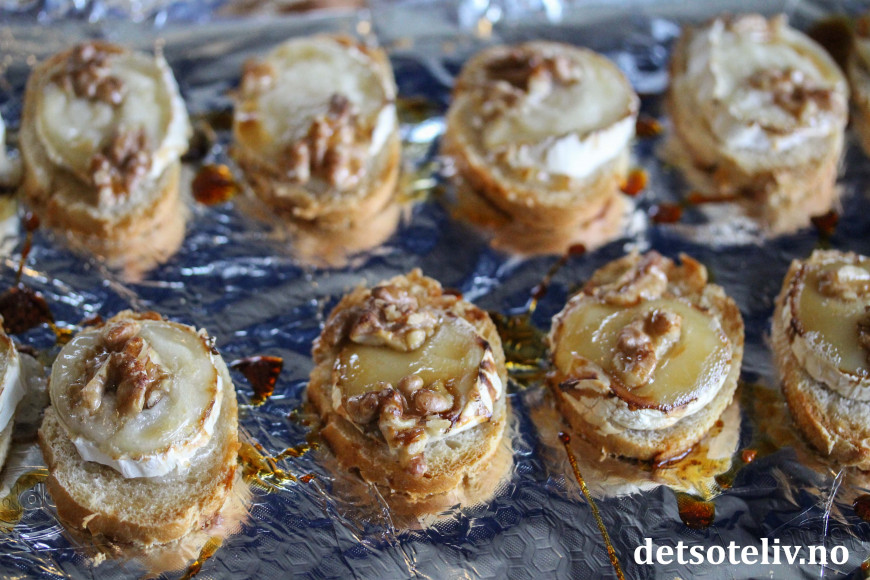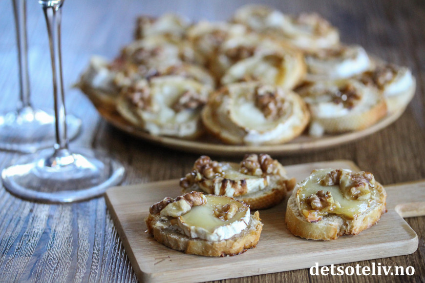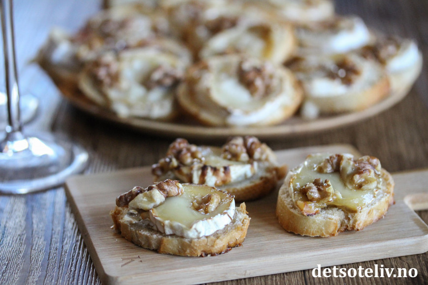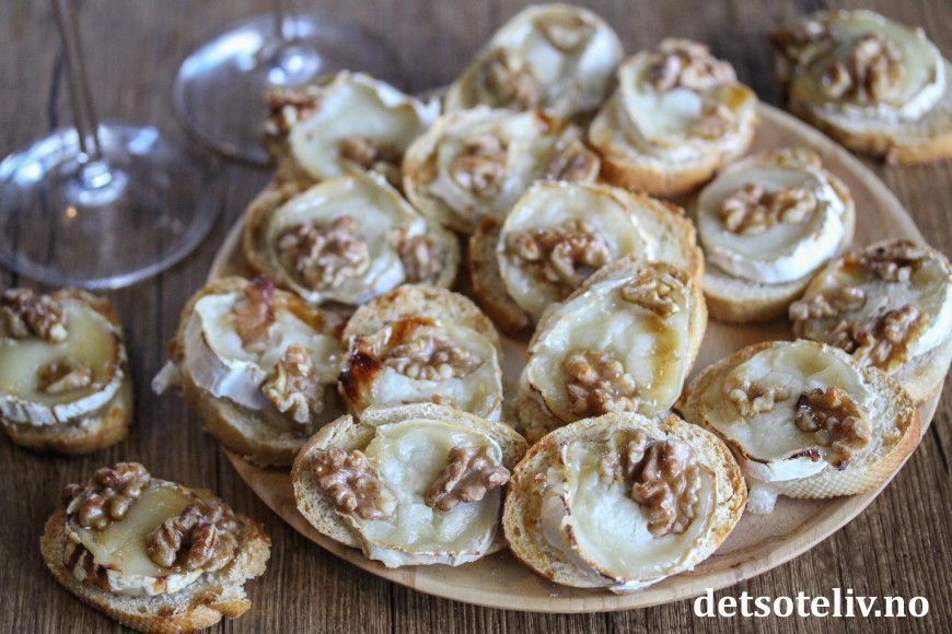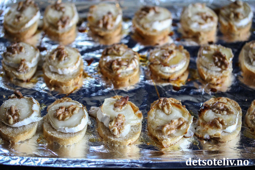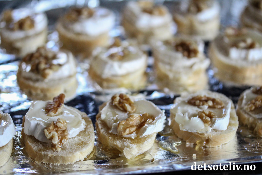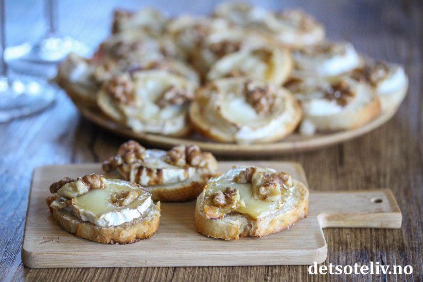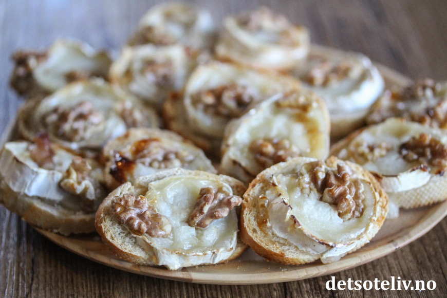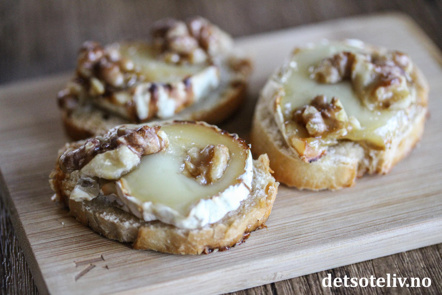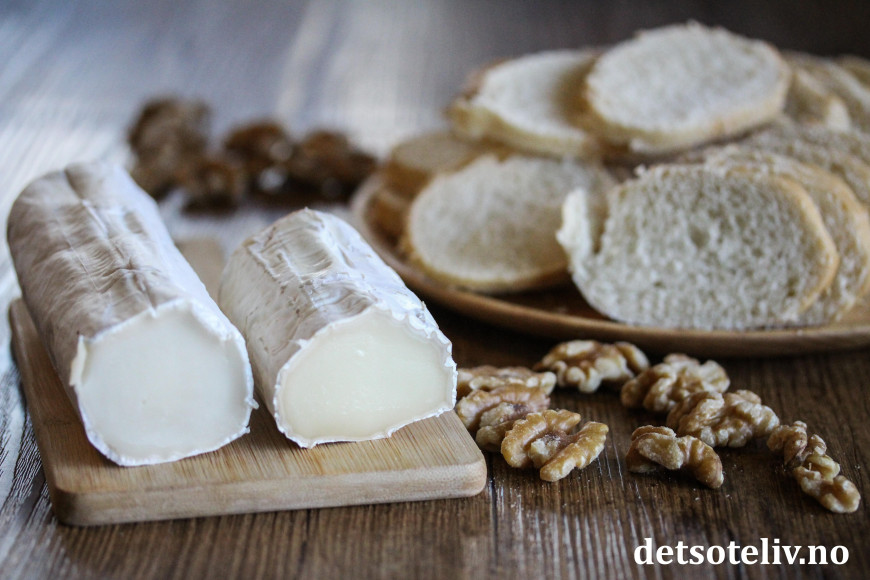♥ Chèvre er en fransk geitost. Jeg har her brukt chèvreruller med skorpe, som skjært i skiver passer perfekt i størrelse til små baguetteskiver.