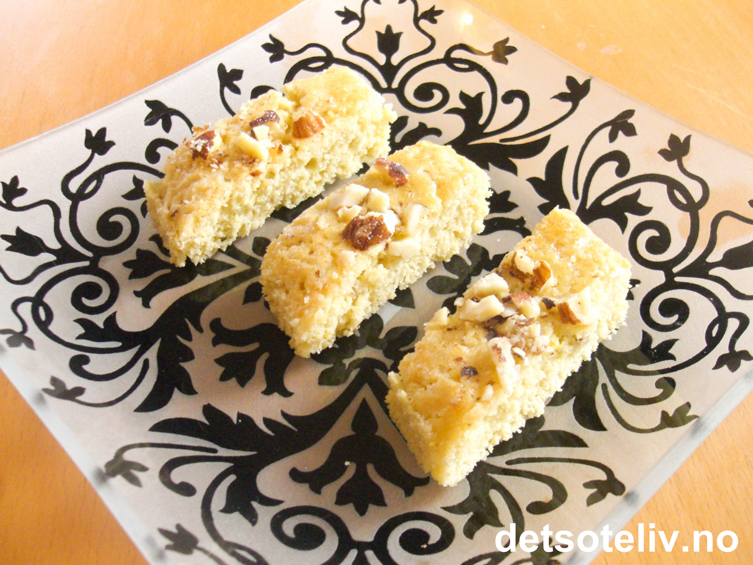 Stek kakene midt i ovnen ved 175°C i 12-15 min. Ta de ut av ovnen og avkjøl i noen minutter. Skjær deretter lengdene på skrå i jevne skiver med en skarp kniv. Legg kakene på bakeplaten og tørk dem i ovnen ved 75°C i ca 1 time. Sjekk at de er tørre. Avkjøles helt på rist før de has i kakeboksen.