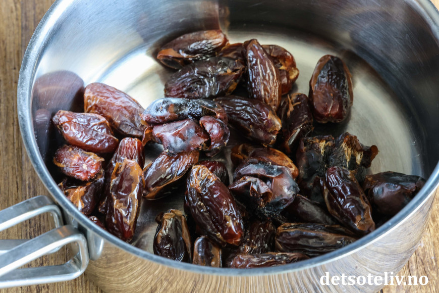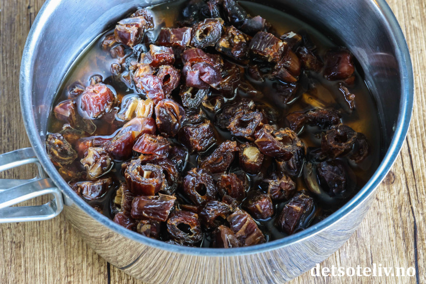 Hell over sterk, varm te. La dadlene trekke i teen i minst 2 timer, og gjerne over natten.
