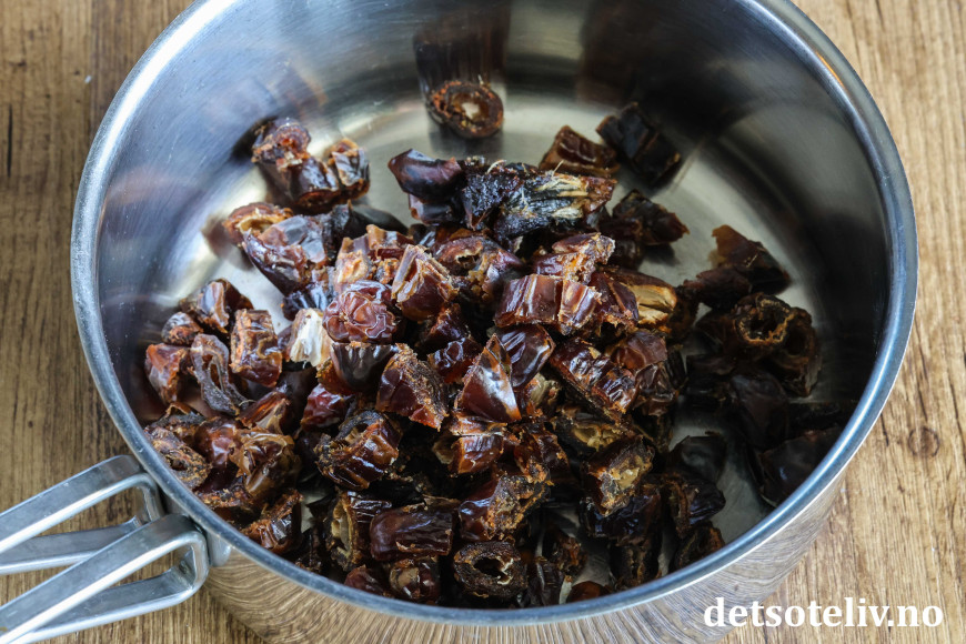 Del dadlene i små biter og fjern stenene. Hell over sterk, varm te. La dadlene trekke i teen i minst 2 timer, og gjerne over natten.