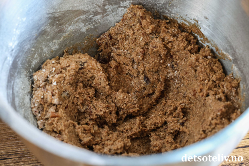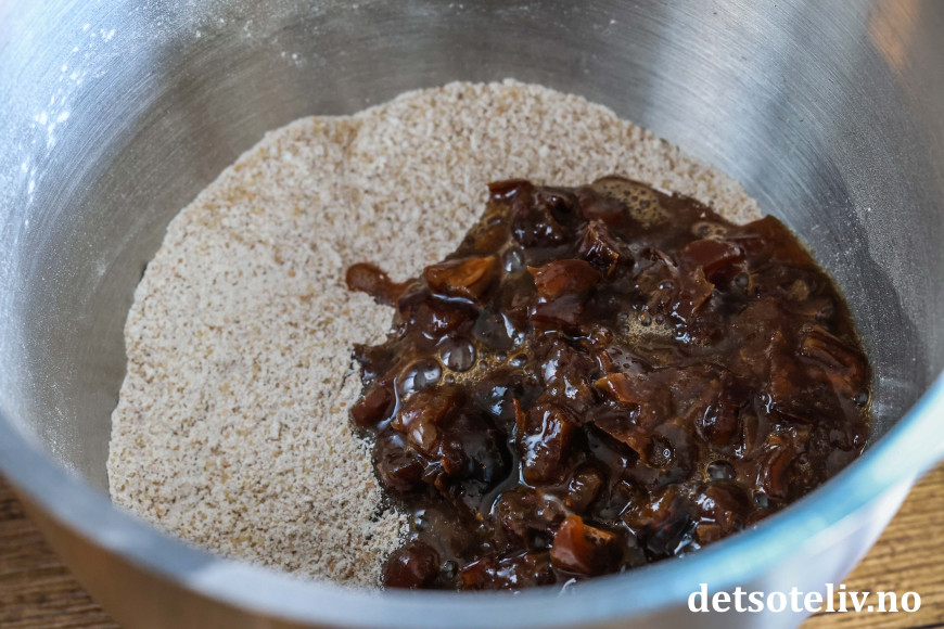 Rør resten av ingrediensene inn i daddelblandingen (inklusive all væske). Bruk helst en maskin med eltekrok. Dadlene skal moses inn i deigen, som skal bli tykk og kompakt.