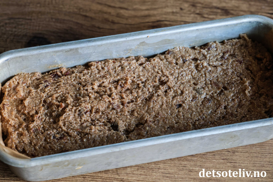 Smør en liten brødform som rommer 1 liter og ha et stykke bakepapir i bunnen. Fordel deigen i formen og jevn til overflaten.