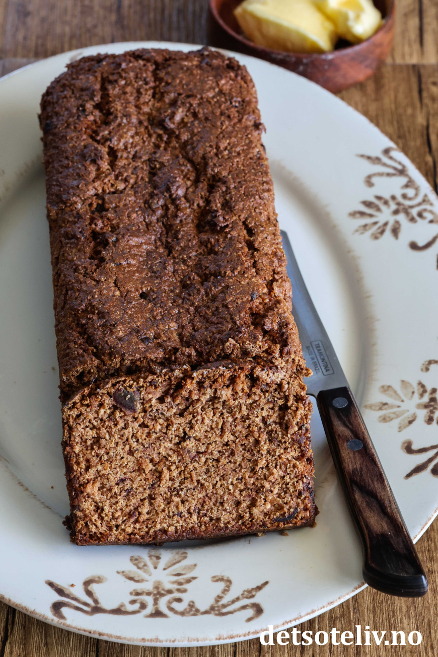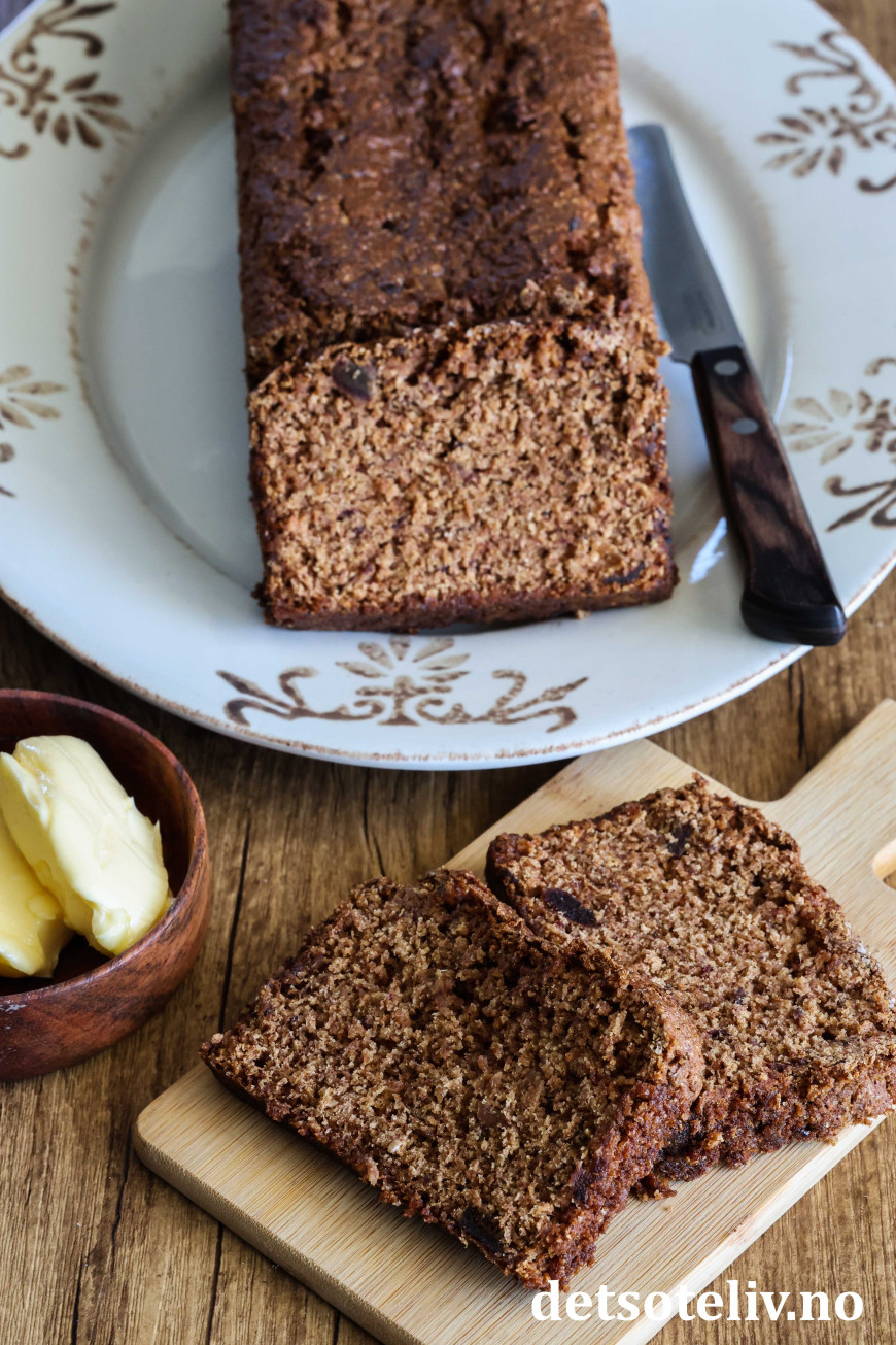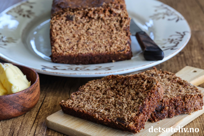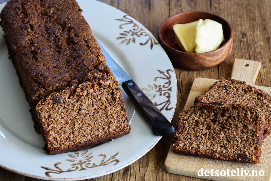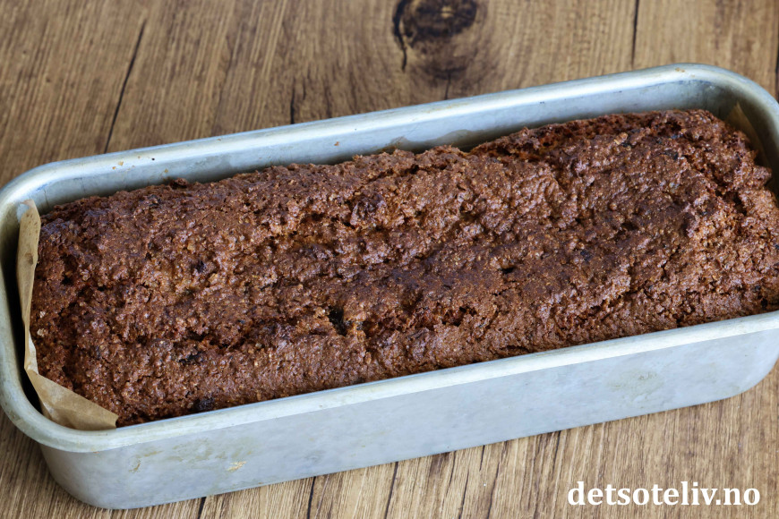 Smør en liten brødform som rommer 1 liter og ha et stykke bakepapir i bunnen. Fordel deigen i formen og jevn til overflaten. Stek kaken på nederste rille i ovnen ved 180°C i ca. 50 minutter (sjekk med kakenål at kaken er gjennomstekt).