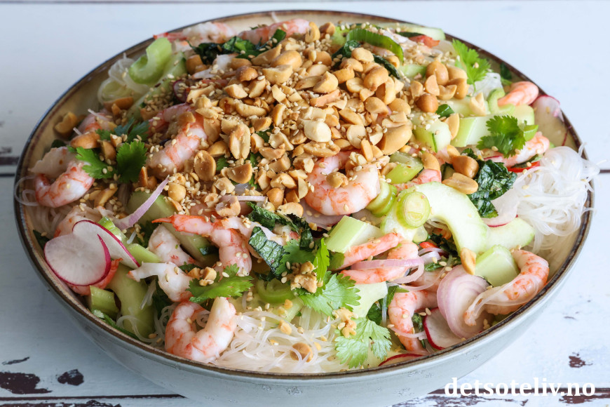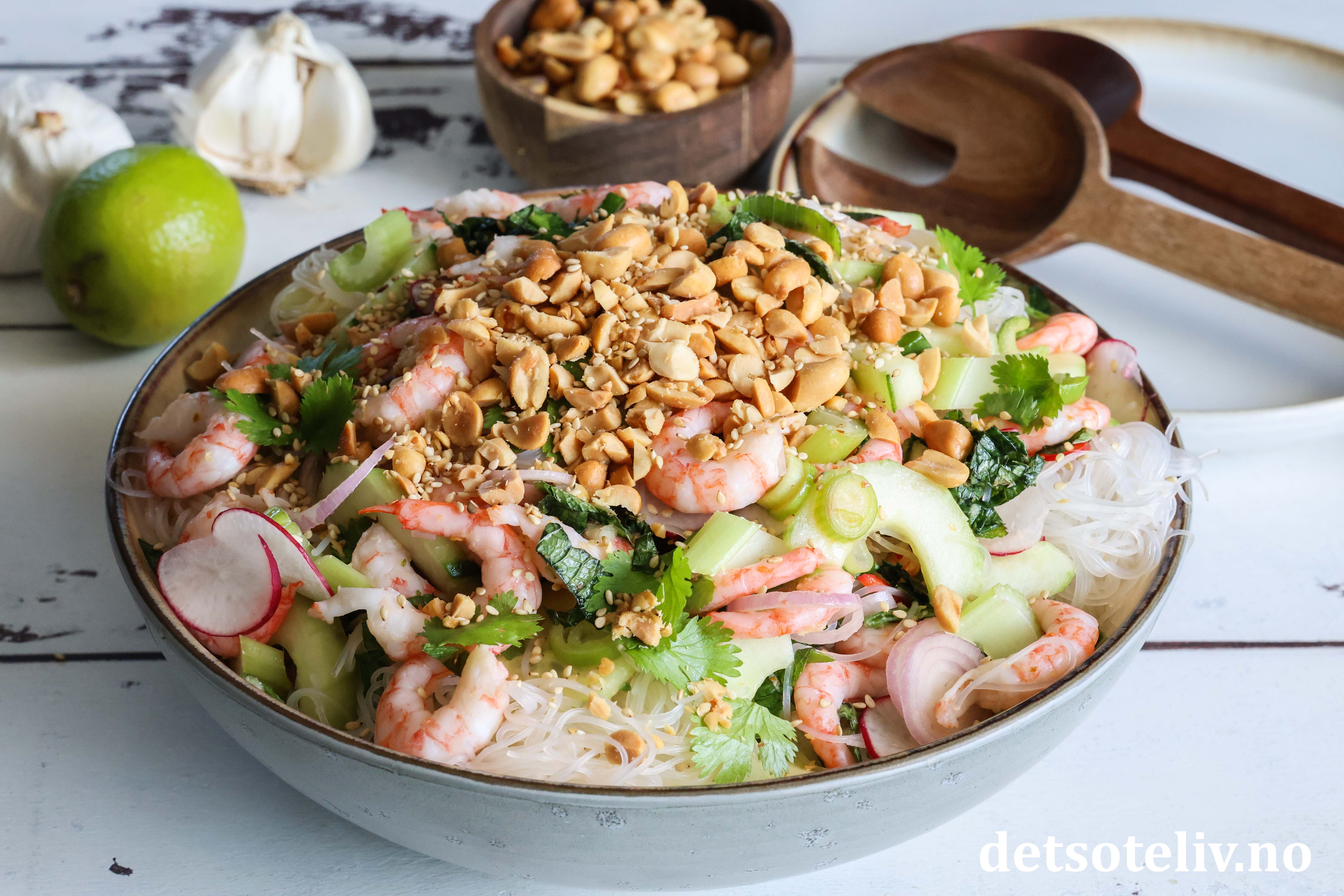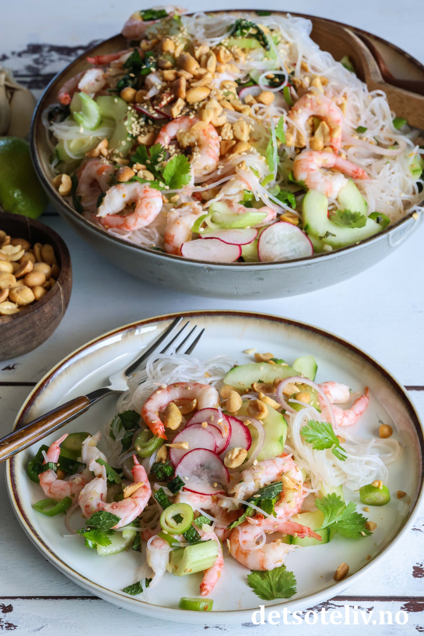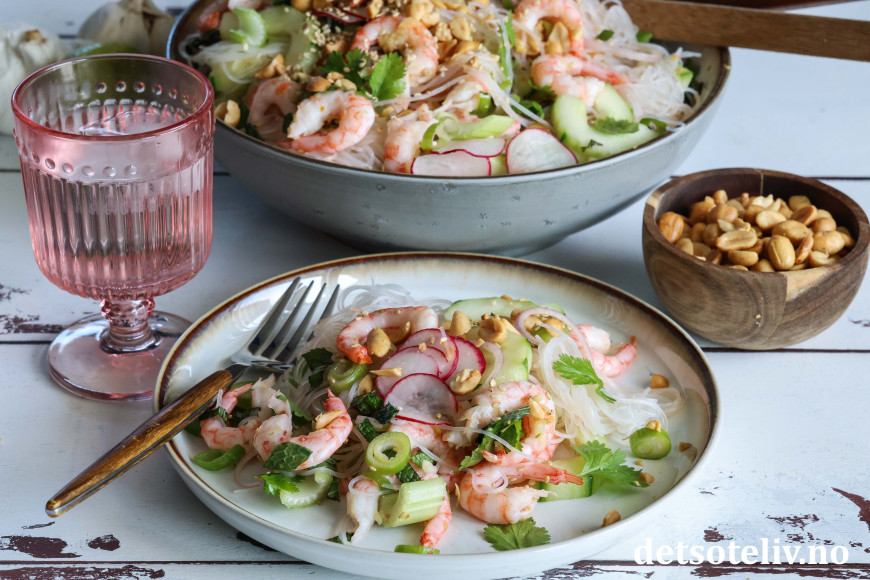 Denne versjonen av glassnudelsalat med reker blir lett og sommerlig. I tillegg til glassnudler og reker brukes agurk, vårløk, sjalottløk, selleri, reddiker, frisk koriander og mynte – og hakkede peanøtter for crunch. Den thailandske dressingen med fiskesaus, riseddik, sesamolje, brunt sukker, hvitløk, ingefær, lime og chili tilfører surt, søtt, salt og sterkt som gir salaten en herlig smak!