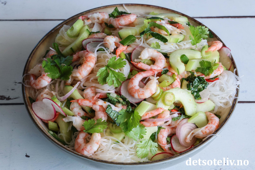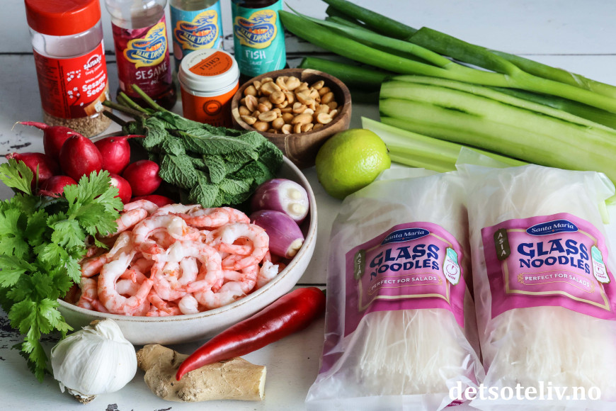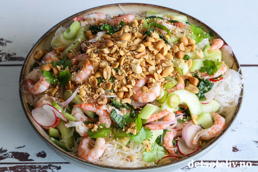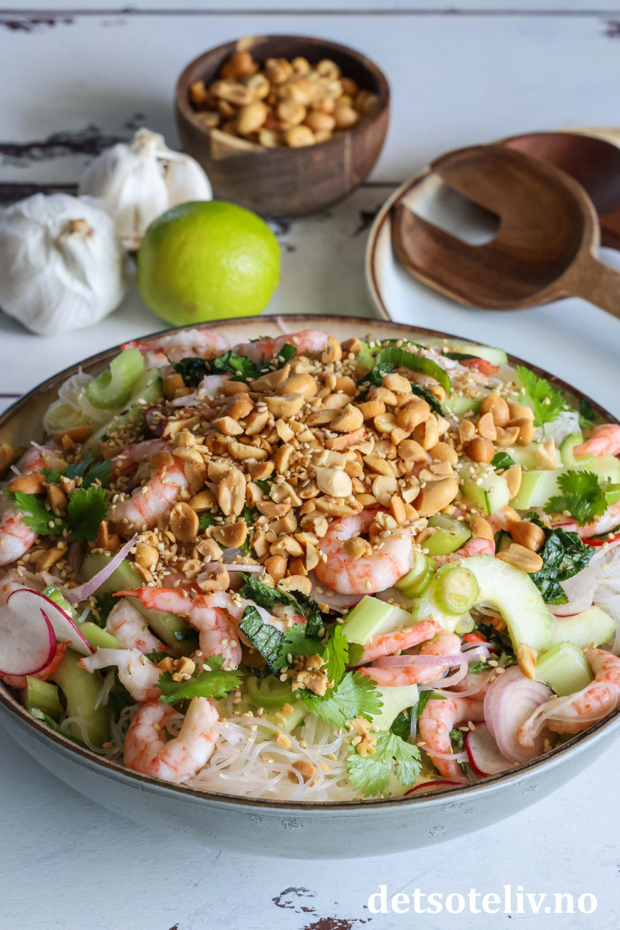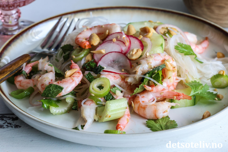 Denne versjonen av glassnudelsalat med reker blir lett og sommerlig. I tillegg til glassnudler og reker brukes agurk, vårløk, sjalottløk, selleri, reddiker, frisk koriander og mynte – og hakkede peanøtter for crunch. Den thailandske dressingen med fiskesaus, riseddik, sesamolje, brunt sukker, hvitløk, ingefær, lime og chili tilfører surt, søtt, salt og sterkt som gir salaten en herlig smak!