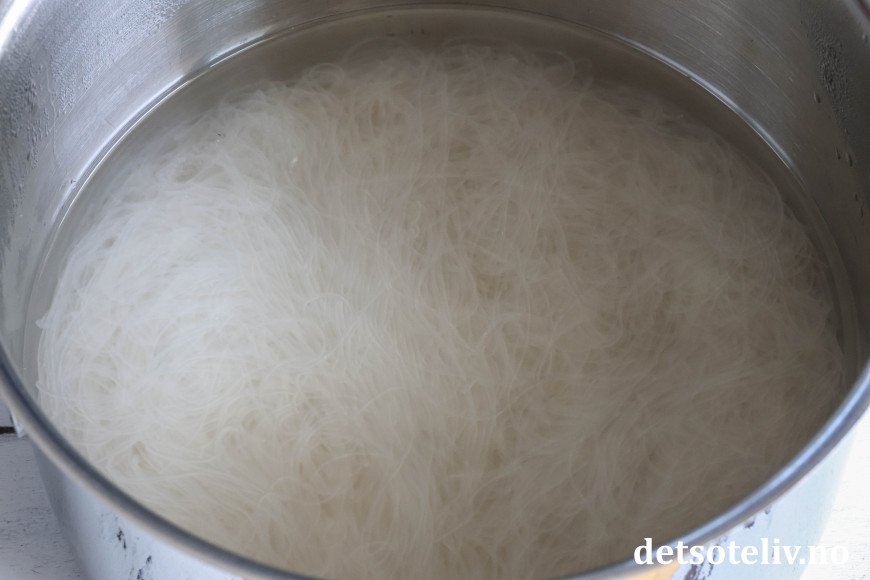 Tilbered glassnudlene som anvist på pakningen. De skal kun ligge i varmt vann i en kort stund og deretter legges i kaldt vann slik at varmebehandlingen opphører.