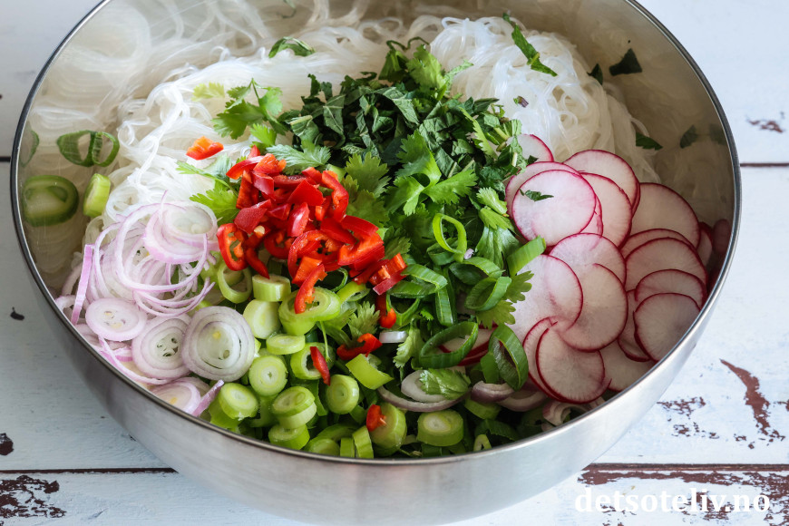 Skrell agurken, skjær over på midten og fjern den bløte innsiden. Kutt agurken deretter opp i skiver. Kutt opp vårløk og skjær sjalottløk i tynne skiver. Kutt selleristengene i biter og skjær reddikene i tynne skiver. Kutt koriander og mynteblader grovt. Skyll chilien og fjern frøene på innsiden før du kutter også denne i mindre biter. Ha alt i bollen med glassnudlene.