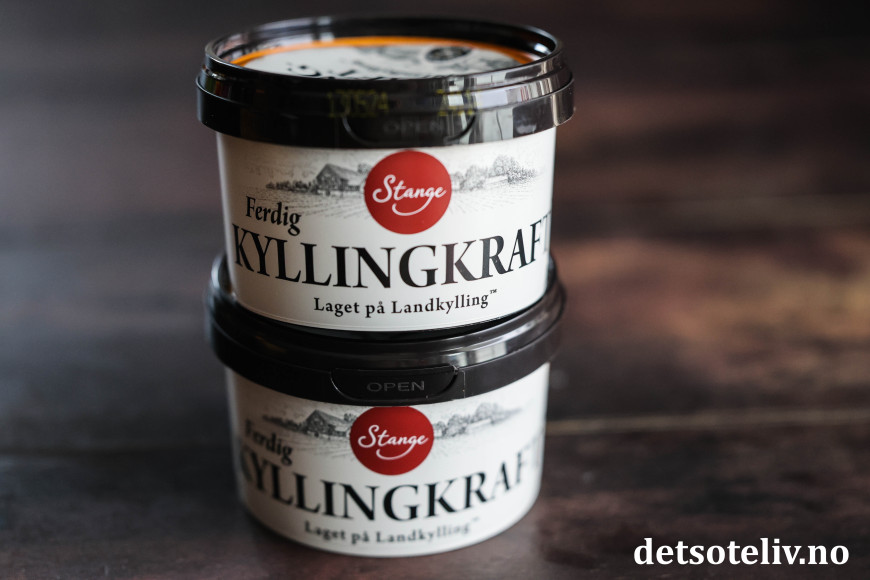 ♥ Jeg brukte her 5 dl ferdigkjøpt kyllingkraft i tillegg til kokevannet fra kokingen av kyllingfiletene. Du kan i stedet bruke kyllingfond eller -buljong (2 stk/terninger) som du løser opp i 5 dl varmt vann.