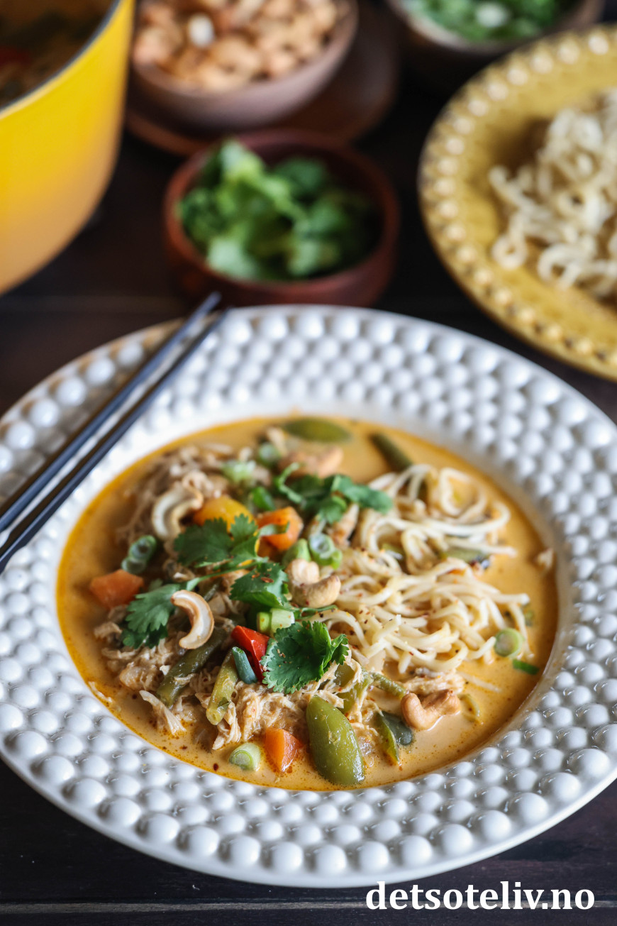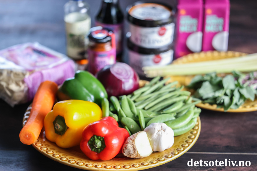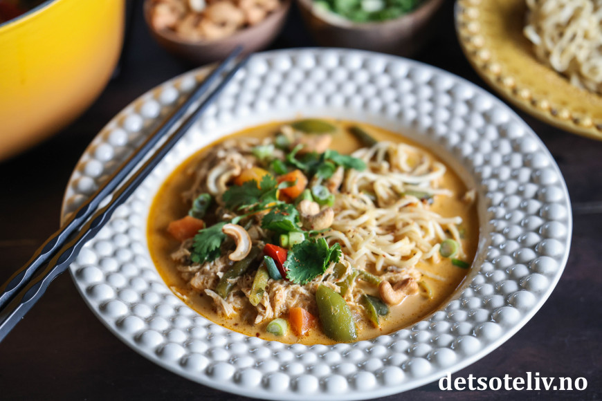 Thailandske ingredienser som red curry paste, thai soyasaus, fiskesaus, thai basilikum og sitrongress fås nå kjøpt i de fleste store, norske matbutikkene. I tillegg får suppen herlig smak av fersk hvitløk, rødløk og ingefær, kokosmelk, koriander og cashewnøtter.