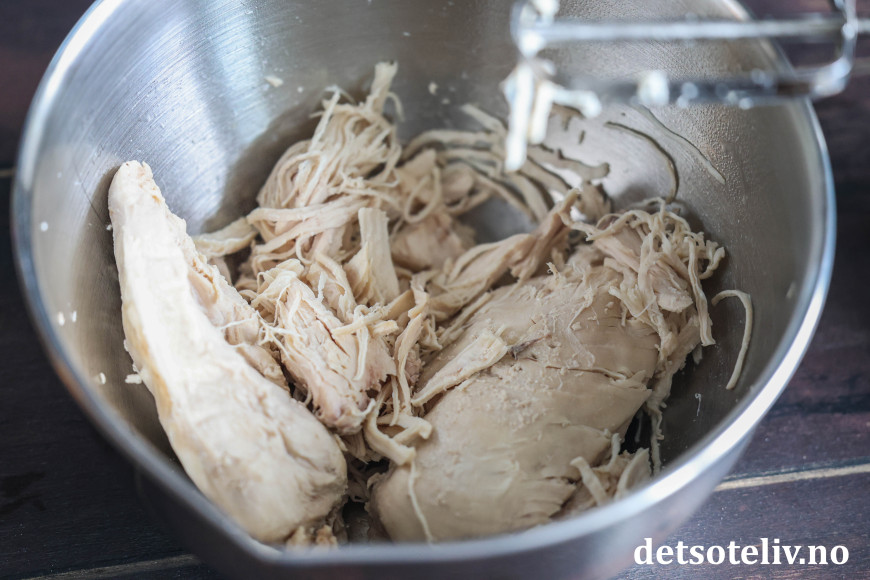Hvis du ikke har håndmikser, kan du rive opp kyllingfiletene i strimler ved hjelp av to gafler, men det tar litt lengre tid. 😊