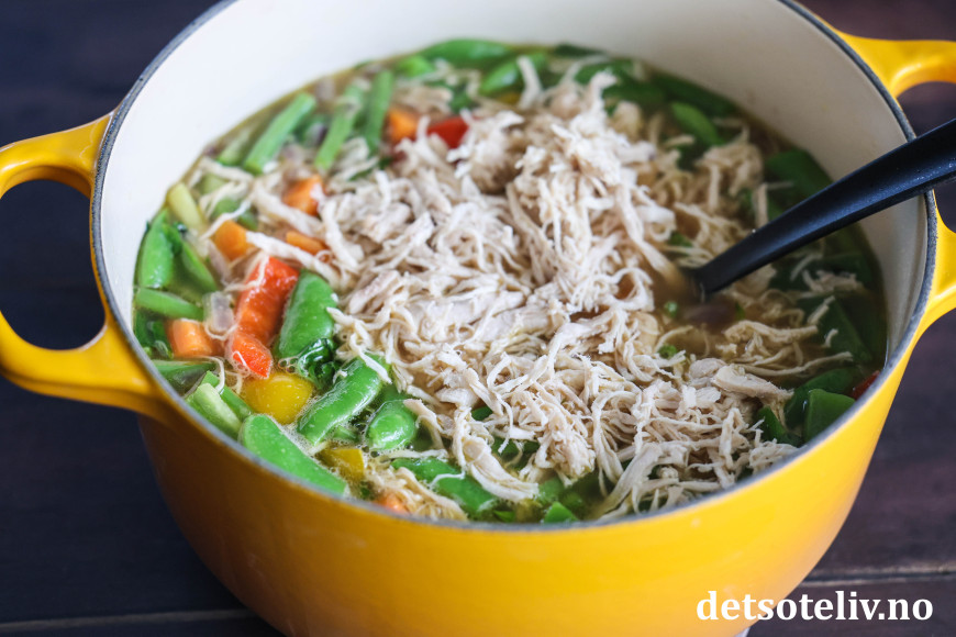 Fargerike, friske grønnsaker og eggnudler gjør kyllingsuppen veldig fristende, god og mettende!