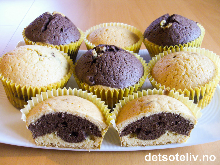 Ha papirformer i muffinsbrett (se tips). Fyll lys og mørk deig i formene i tre lag til de er ca 3/4 fulle. Du kan variere med å begynne med mørk eller lys deig.