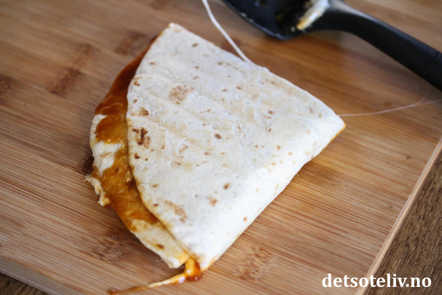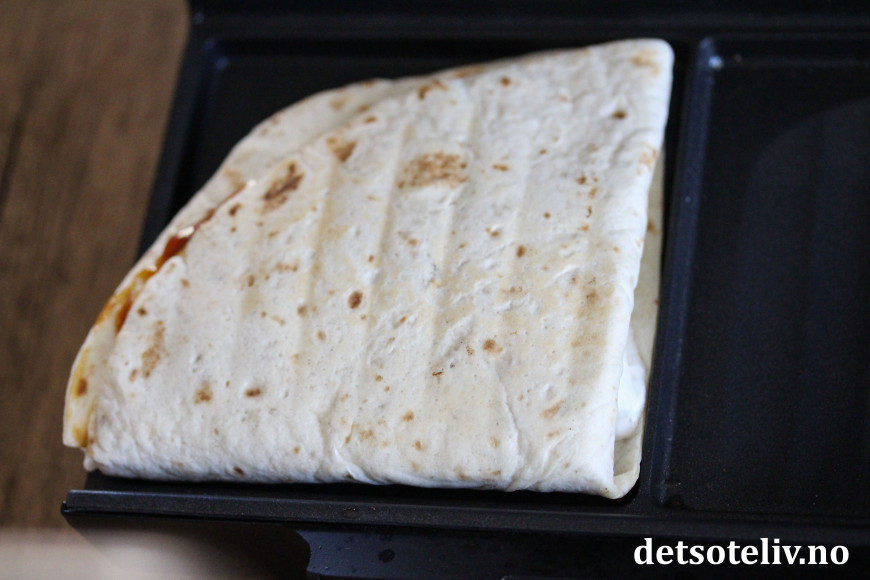 Det går også fint å gjøre dette i en tørr stekepanne på middels varme, og så snu rundt på tortillalefsen et par ganger (steketiden blir da noe lengre, ca 5 minutter på hver side).