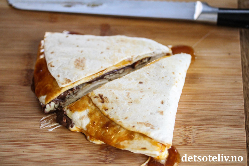 Del den ferdigstekte tortilla-wrapen eventuelt på midten.