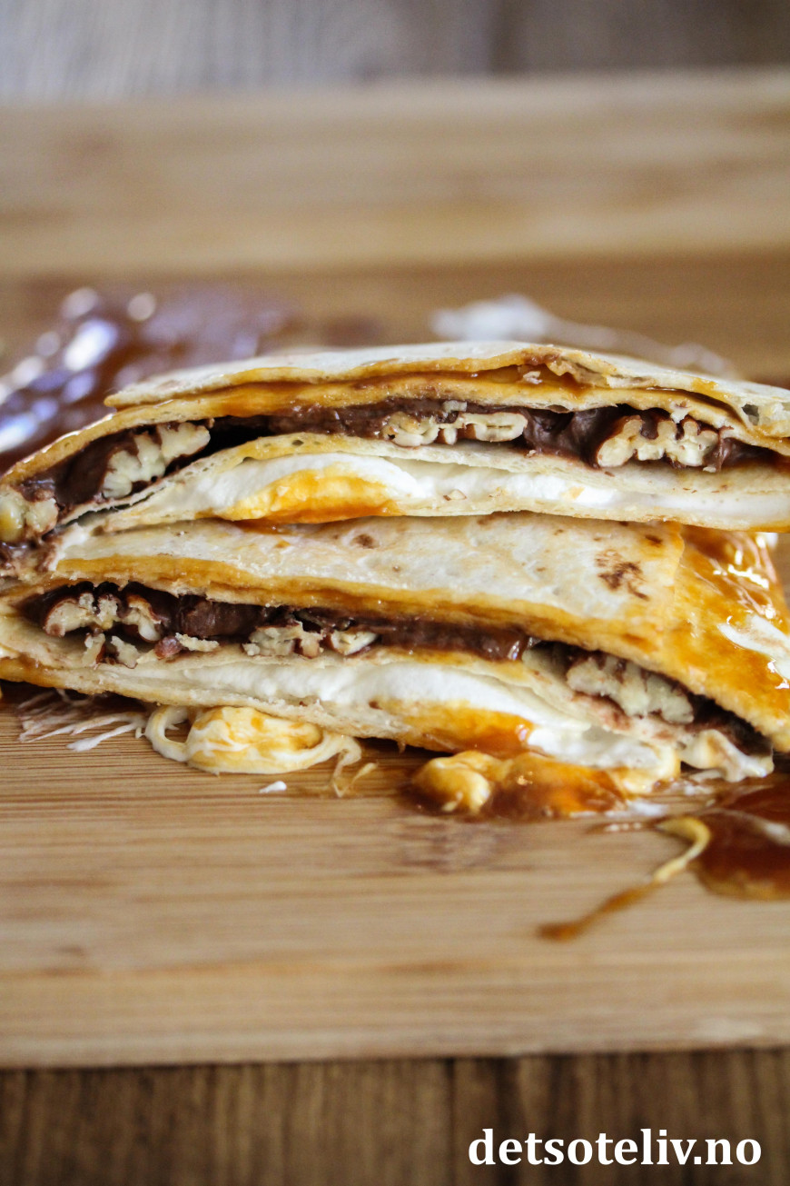 ♥ Jeg har her brukt hjemmelaget karamell etter DENNE oppskriften. Jeg pleier som regel å ha en krukke med hjemmelaget karamell stående fordi den tåler så godt å oppbevares i romtemperatur. Merk at karamellsausen er tyntflytende når den er nykokt, og må stå i romtemperatur i hvert fall over natten for å få en tykk smørekonsistens slik at den kan smøres utover en tortillalefse. Min hadde stått i et par uker og var derfor ekstra tykk i konsistensen.
