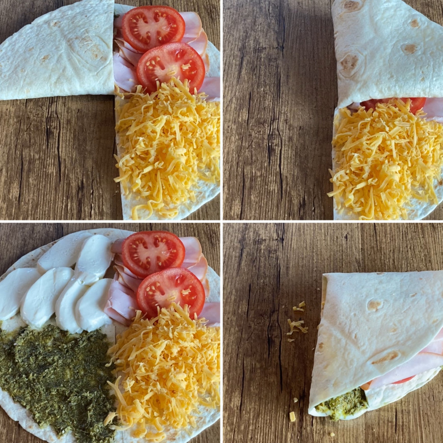 Det er greit å bruke noe kremete (f eks pesto, majones, ketchup), noe protein (slik som skinke eller kyllingbiter) eller vegetar-alternativ, og så en god del ost. Osten smelter jo ved oppvarming og gjør at den ferdiggrillede tortillaen henger godt sammen. Jeg bruker her både fersk mozzarella-ball som jeg har skjært i skiver og masse revet cheddar.