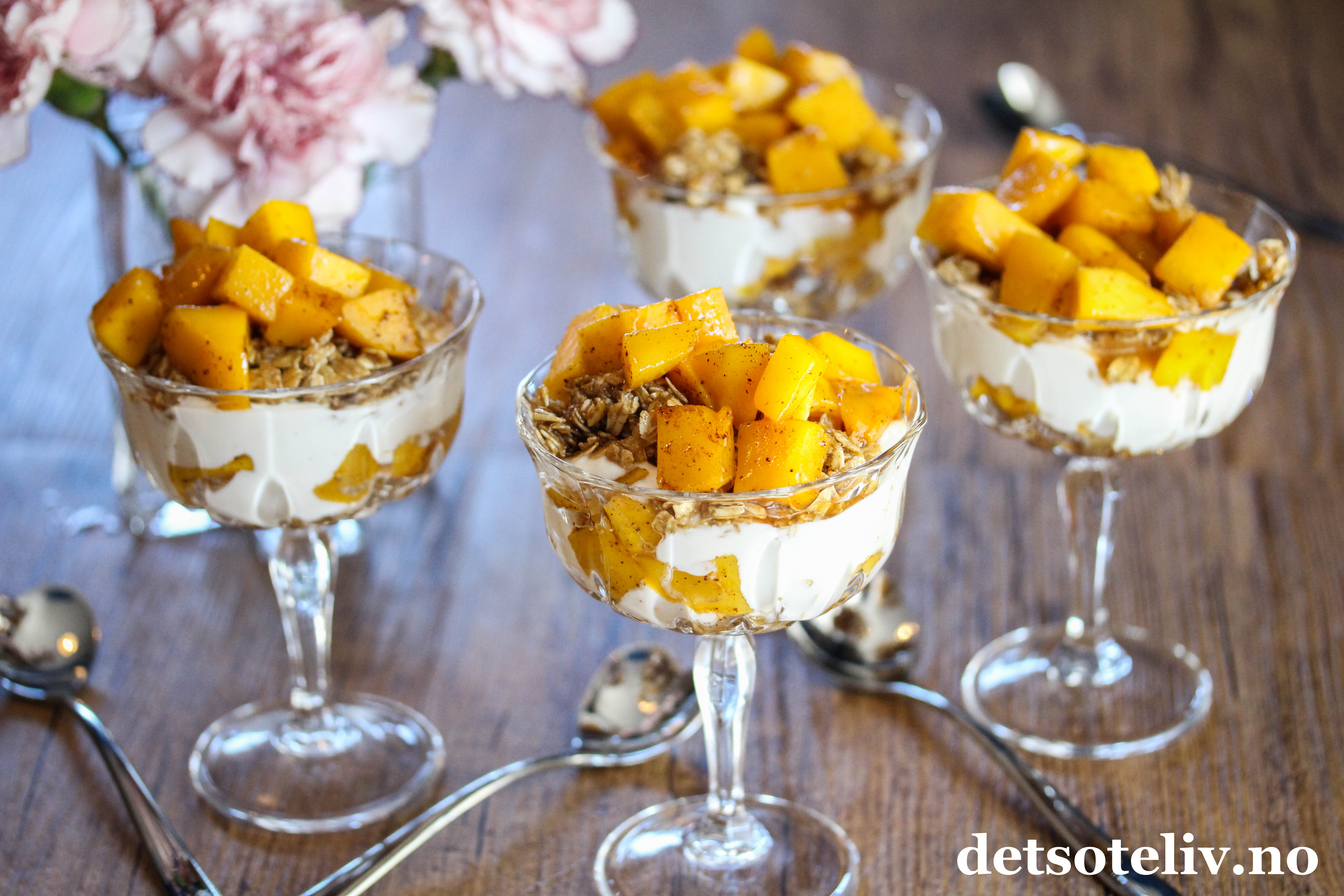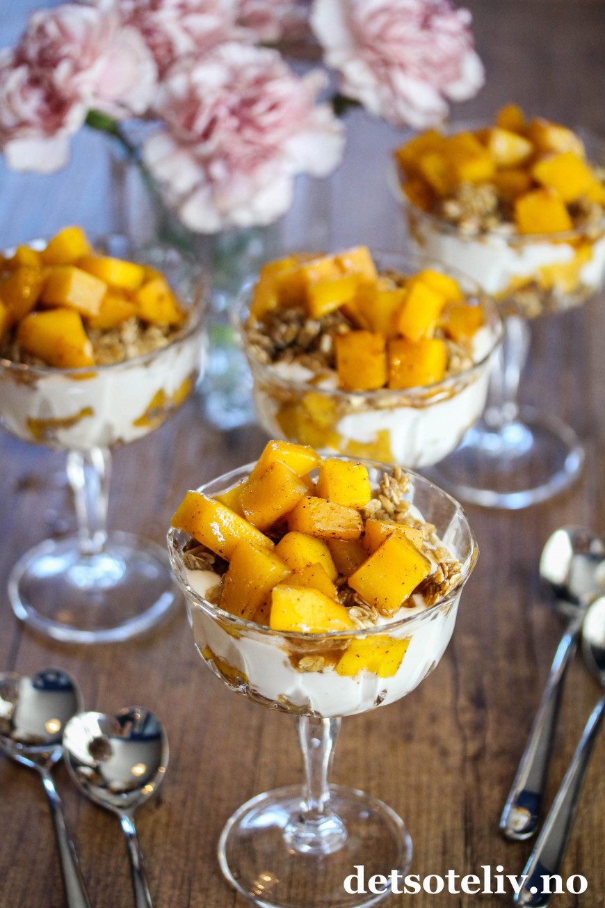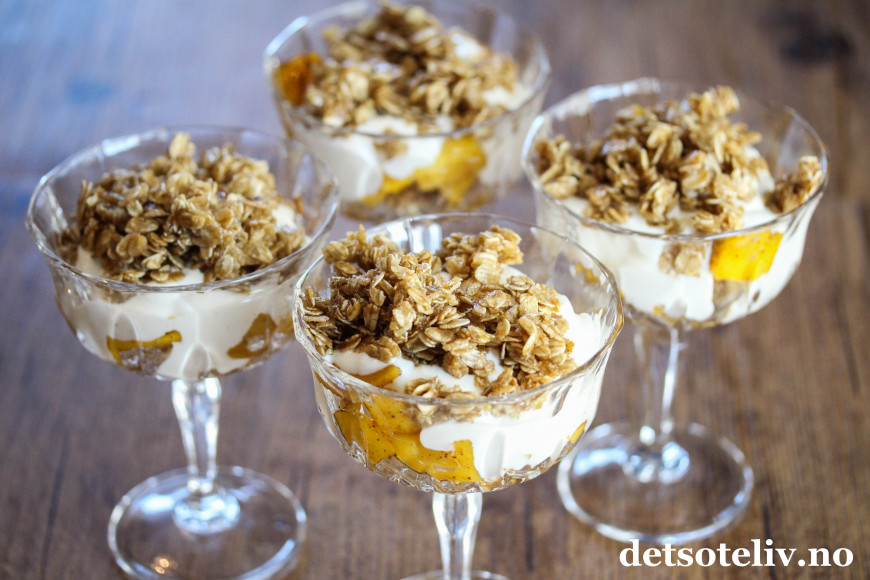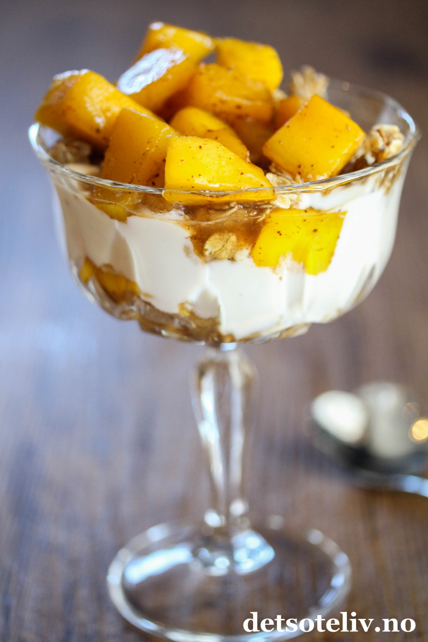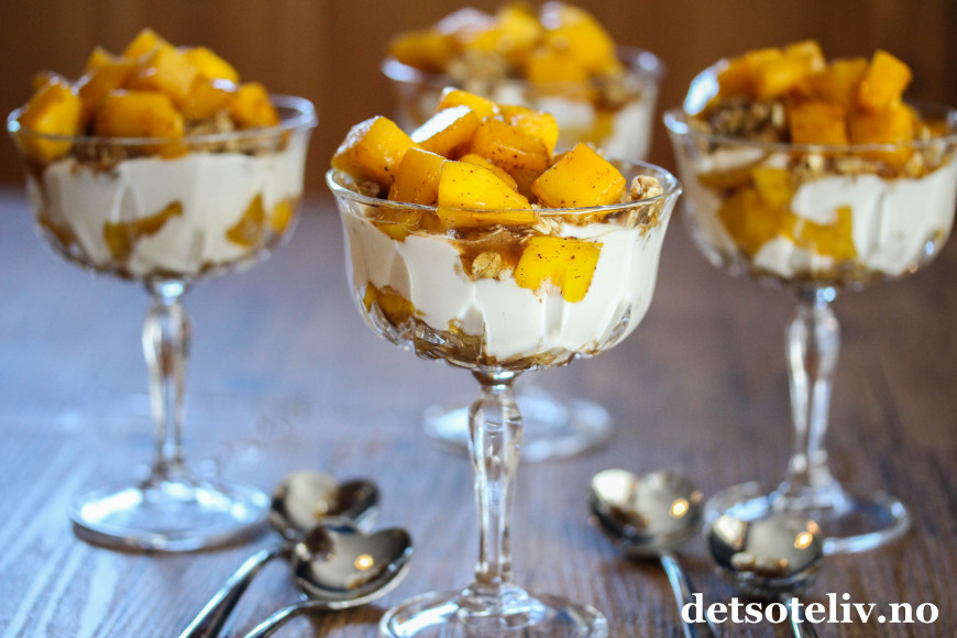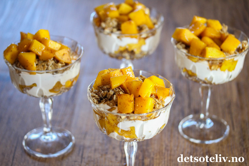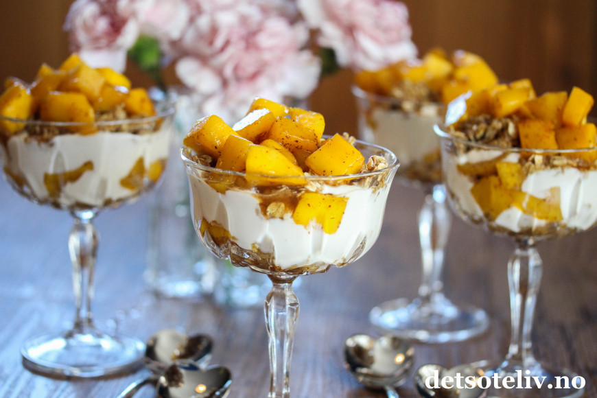 Tilslørte bondepiker er en klassisk norsk dessert der eplemos legges lagvis med krem og stekt kavring. Her har jeg laget en vri med mango som er surret i kanelsirup, og som legges lagvis med vaniljekesam og havregryn som jeg har stekt i sirup og kardemomme.