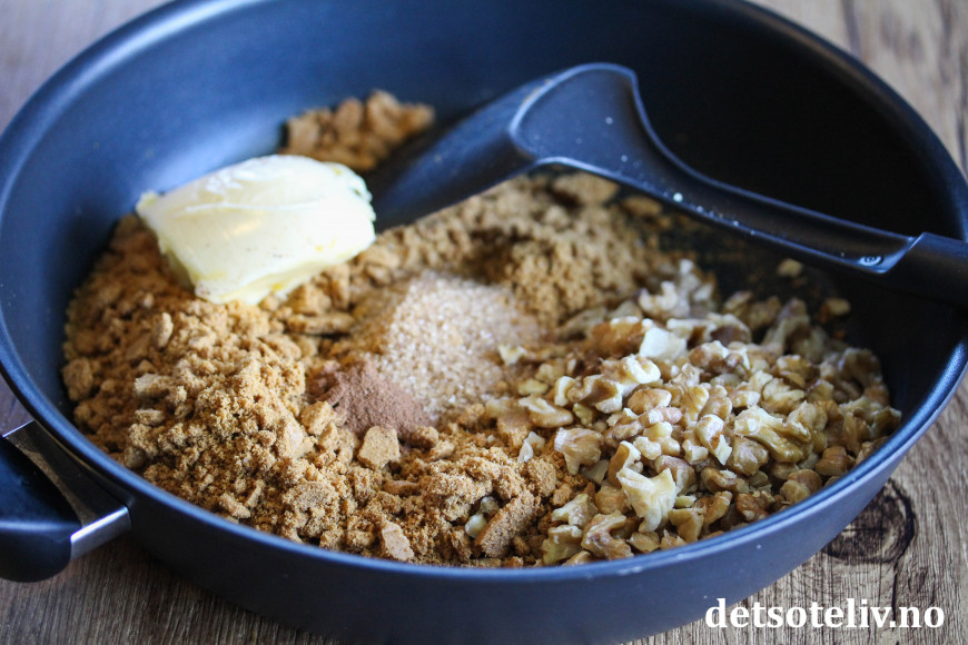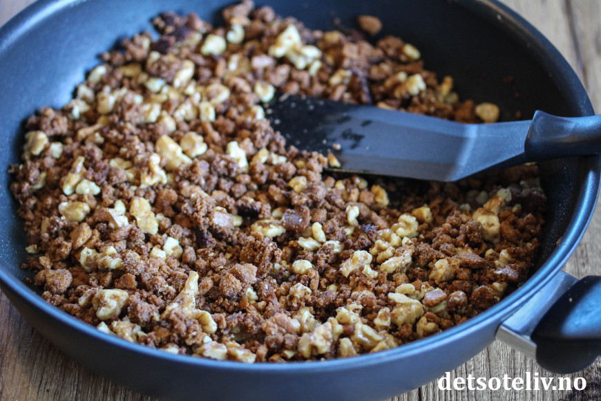 Knus pepperkakene og ha smulene i en stekepanne med smør, brunt sukker, kanel og grovt hakkede valnøtter. Varm opp og stek blandingen litt på middels varme så du får frem den gode aromaen, mens du hele tiden rører med en stekespade. Avkjøl.
