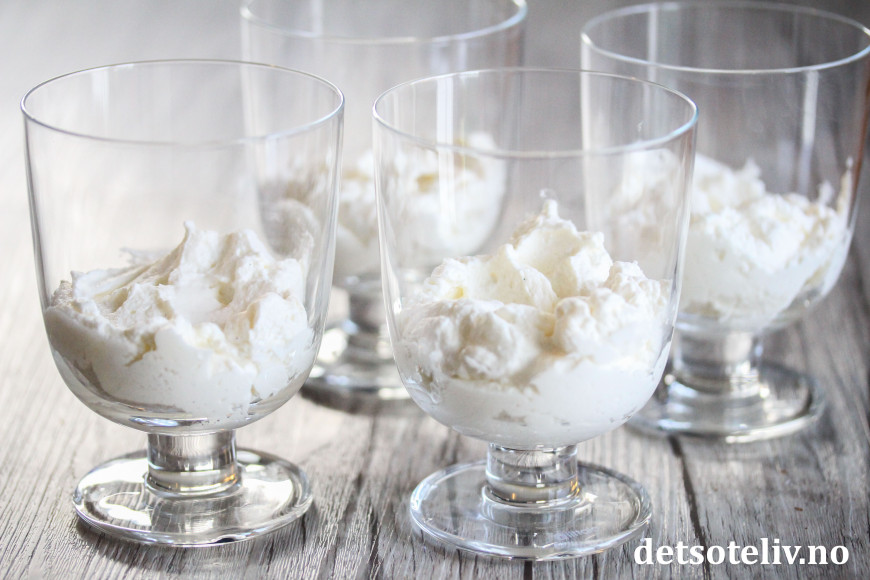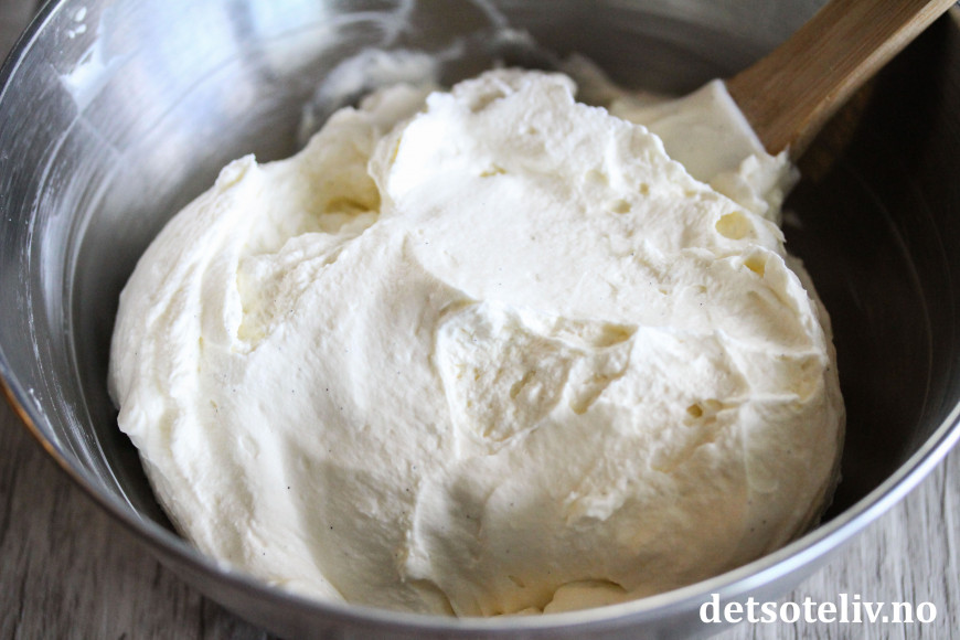 ♥ Mascarponekremen er fyldig og deilig, men ønsker du en mindre mektig krem, kan du droppe mascarponeost og bare bruke kremfløte som piskes sammen med melis og vaniljepasta.