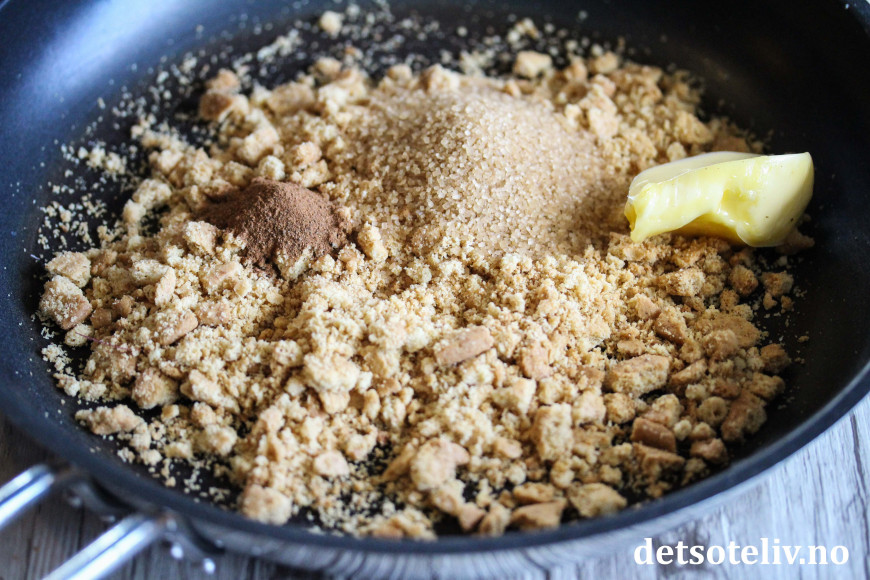 Knus kjeksen og ha smulene i en stekepanne med smør, brunt sukker og kanel.