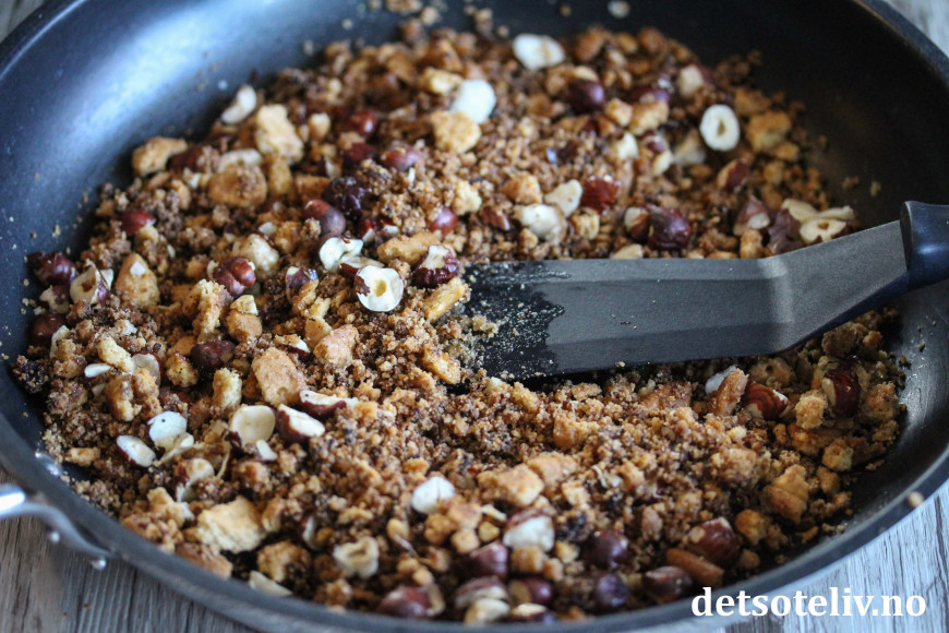 Varm opp og stek smulene litt på middels varme. Rør stadig med en stekespade så smulene ikke svir seg. Tilsett hakkede nøtter på slutten av steketiden. Avkjøl.