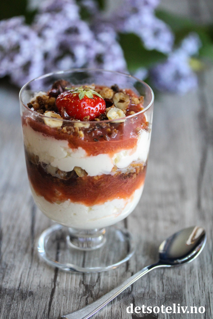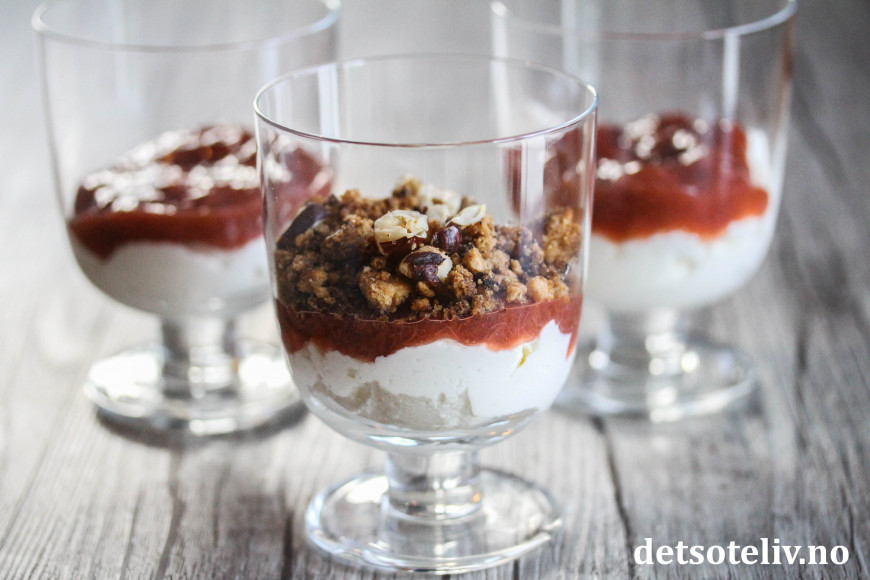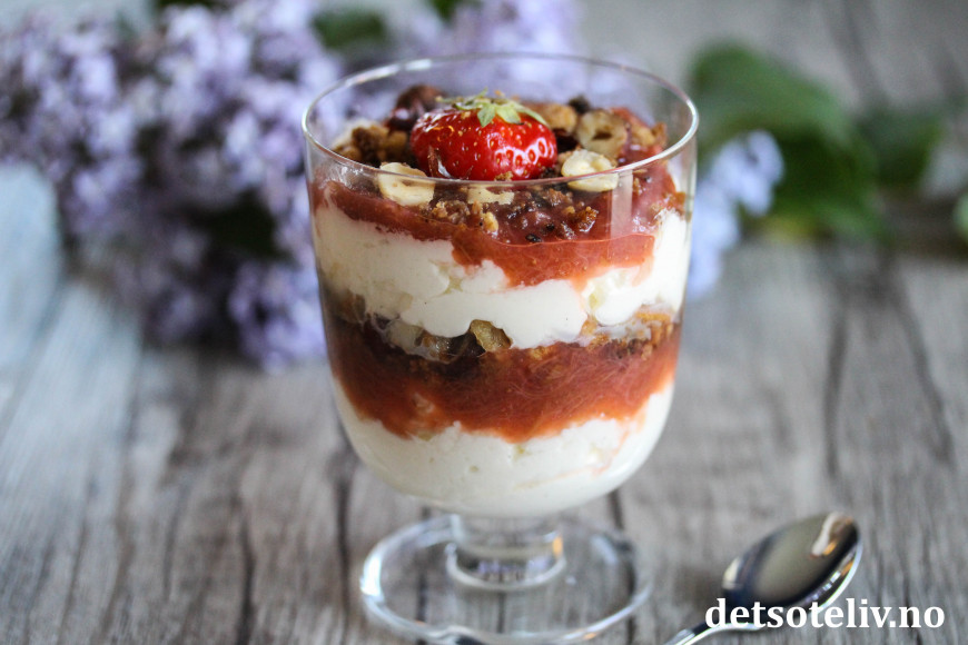 Jeg har byttet eplemosen med kokt rabarbrakompott, som jeg har lagt lagvis med havrekjeks som jeg har stekt sammen med krydder og hasselnøtter, og så en deilig mascarponekrem.