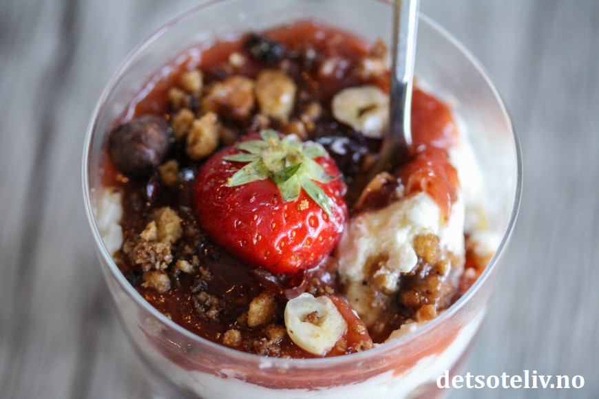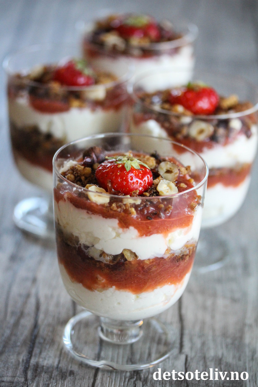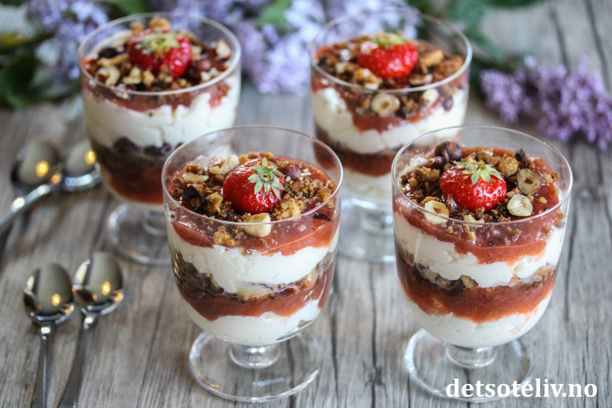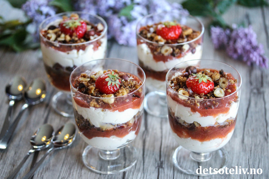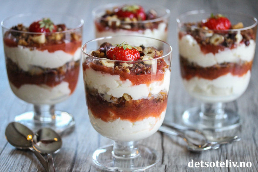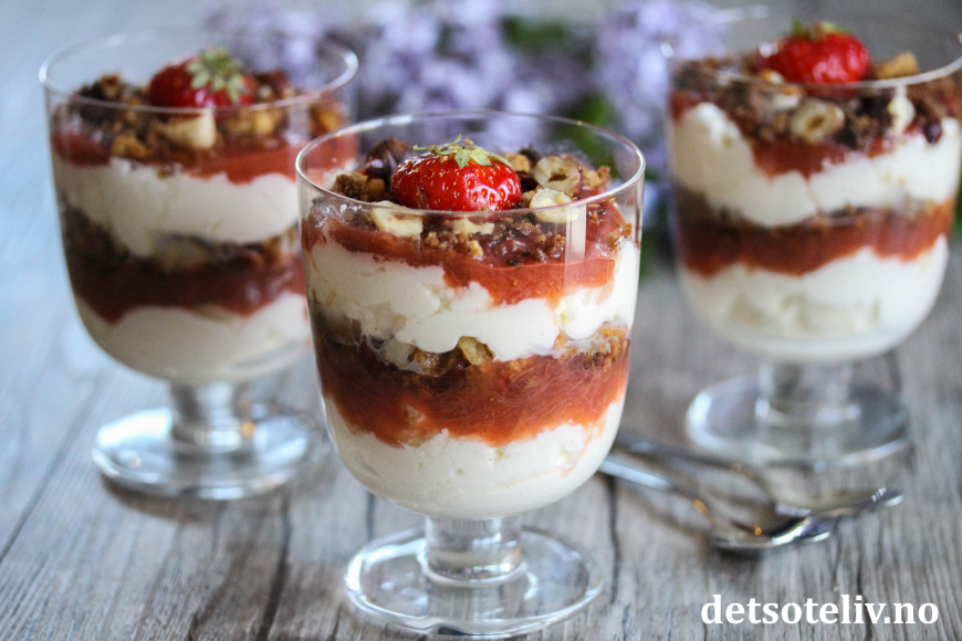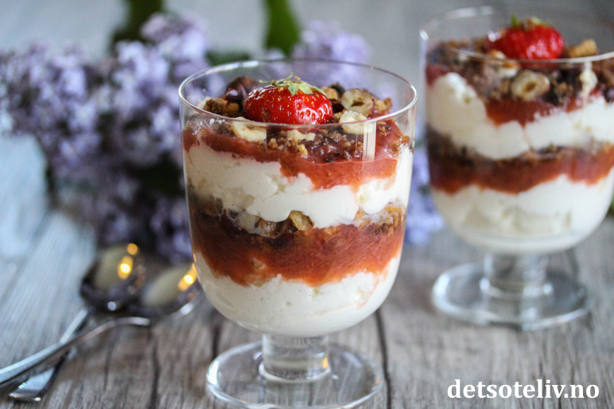 Gjenta med et nytt lag mascarponekrem, og så kompott og smuler og nøtter.