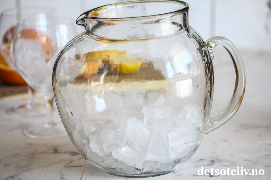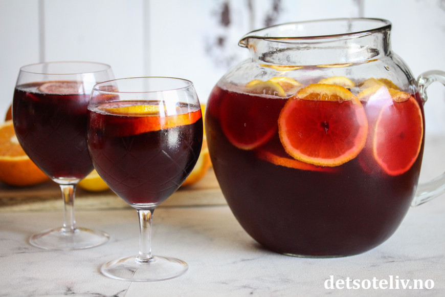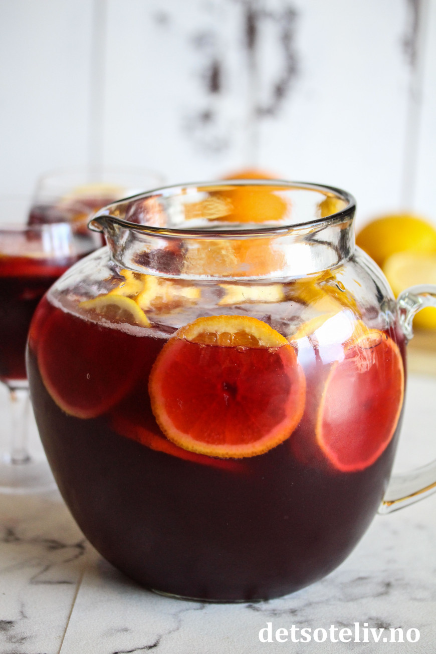 Her blandes rødvin og sitronbrus 50/50, og serveres med masse isbiter og skiver av sitron og appelsin.