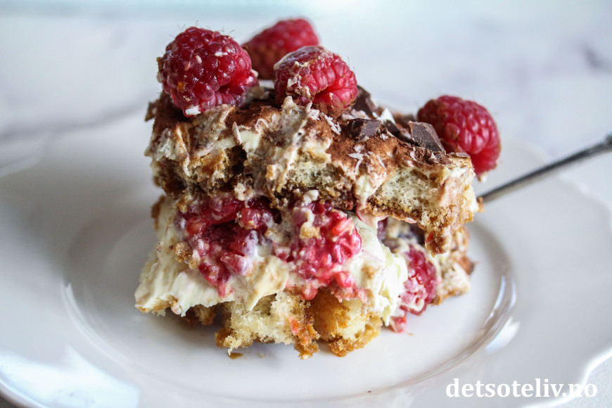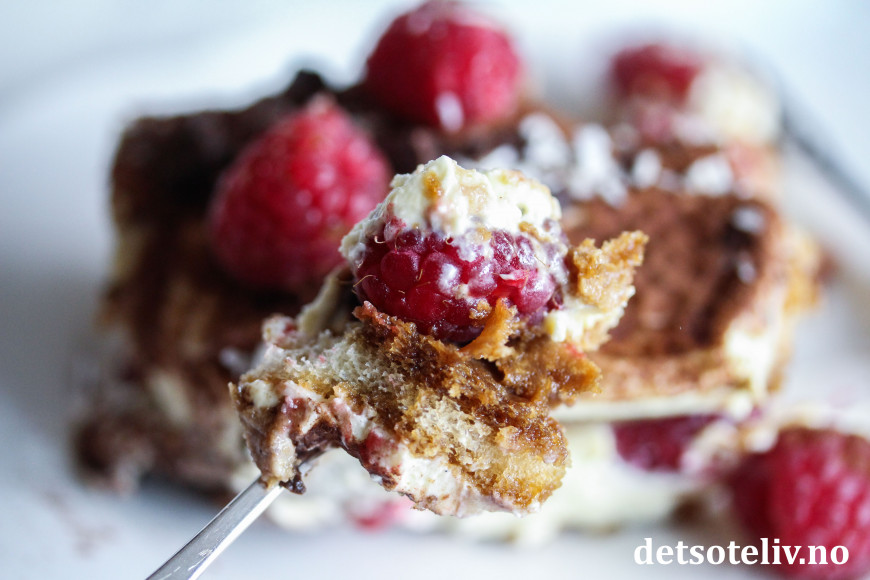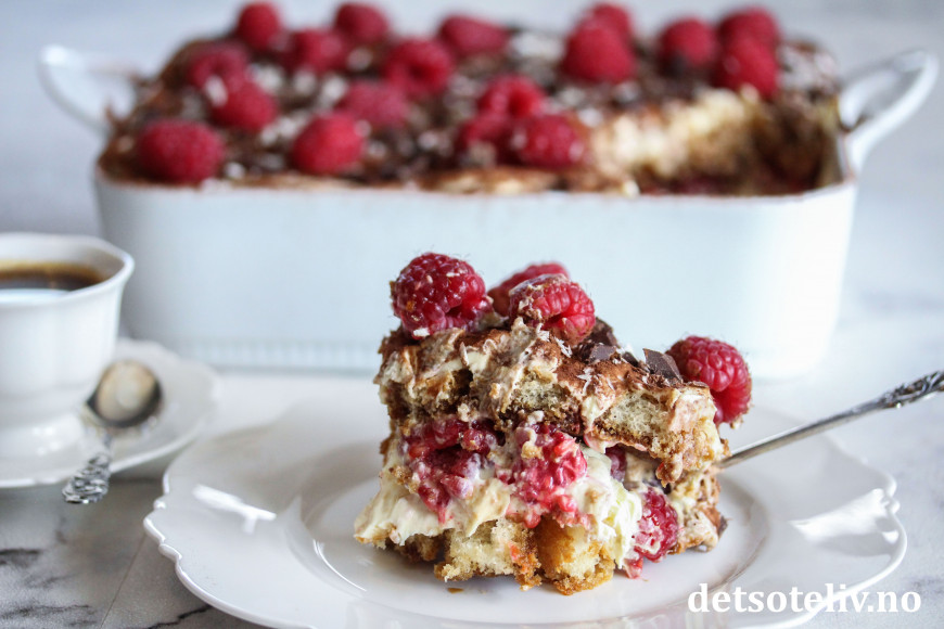 Desserten inneholder alle de klassiske ingrediensene i kombinasjon med friske bringebær.